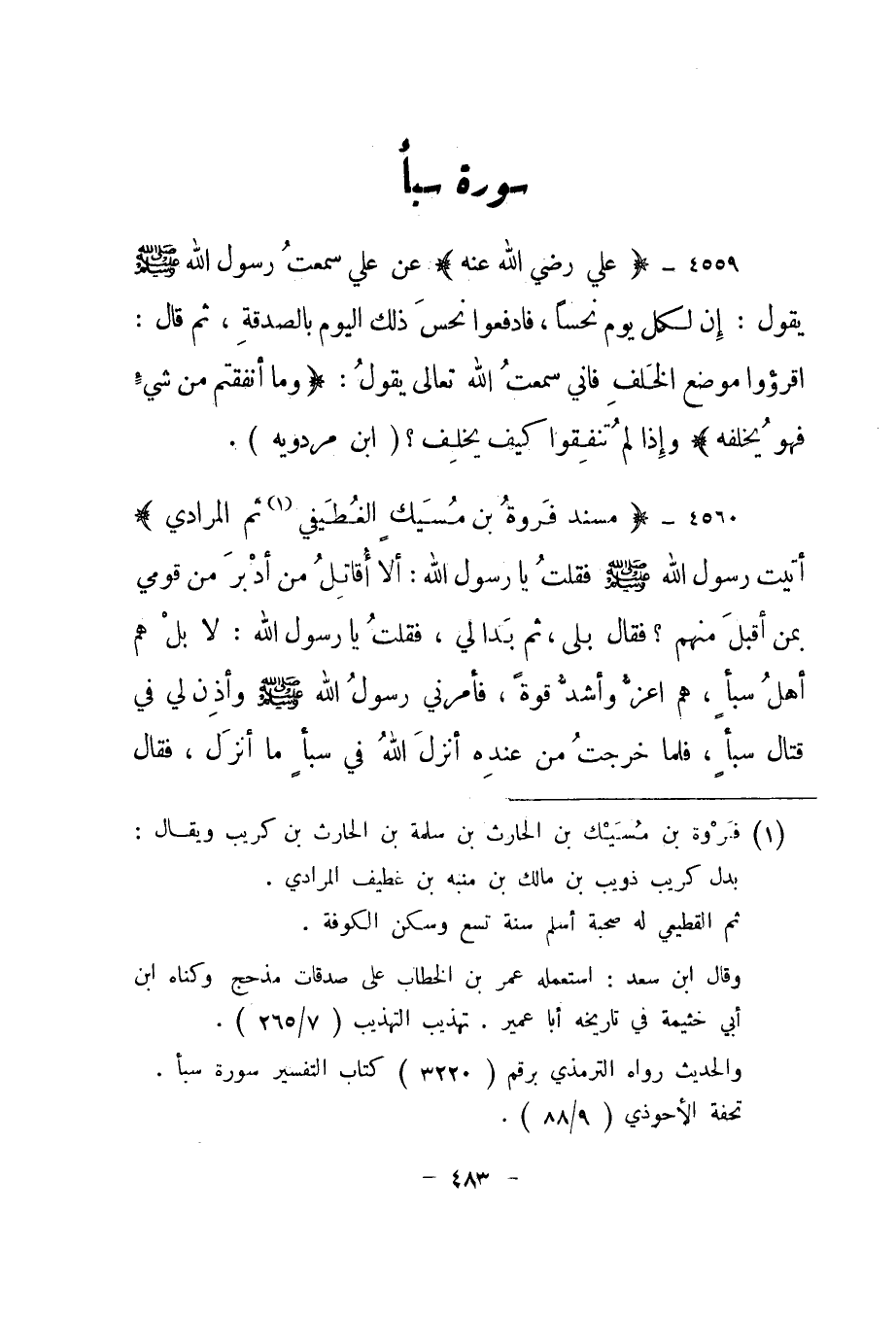 4560- "مسند فروة بن مسيك الغطيفي1 ثم المرادي" أتيت رسول الله صلى الله عليه وسلم فقلت يا رسول الله: ألا أقاتل من أدبر من قومي بمن أقبل منهم؟ فقال بلى، ثم بدا لي، فقلت يا رسول الله: لا بل هم أهل سبأ، هم أعز وأشد قوة، فأمرني رسول الله صلى الله عليه وسلم وأذن لي في قتال سبأ، فلما خرجت من عنده أنزل الله في سبأ ما أنزل، فقال