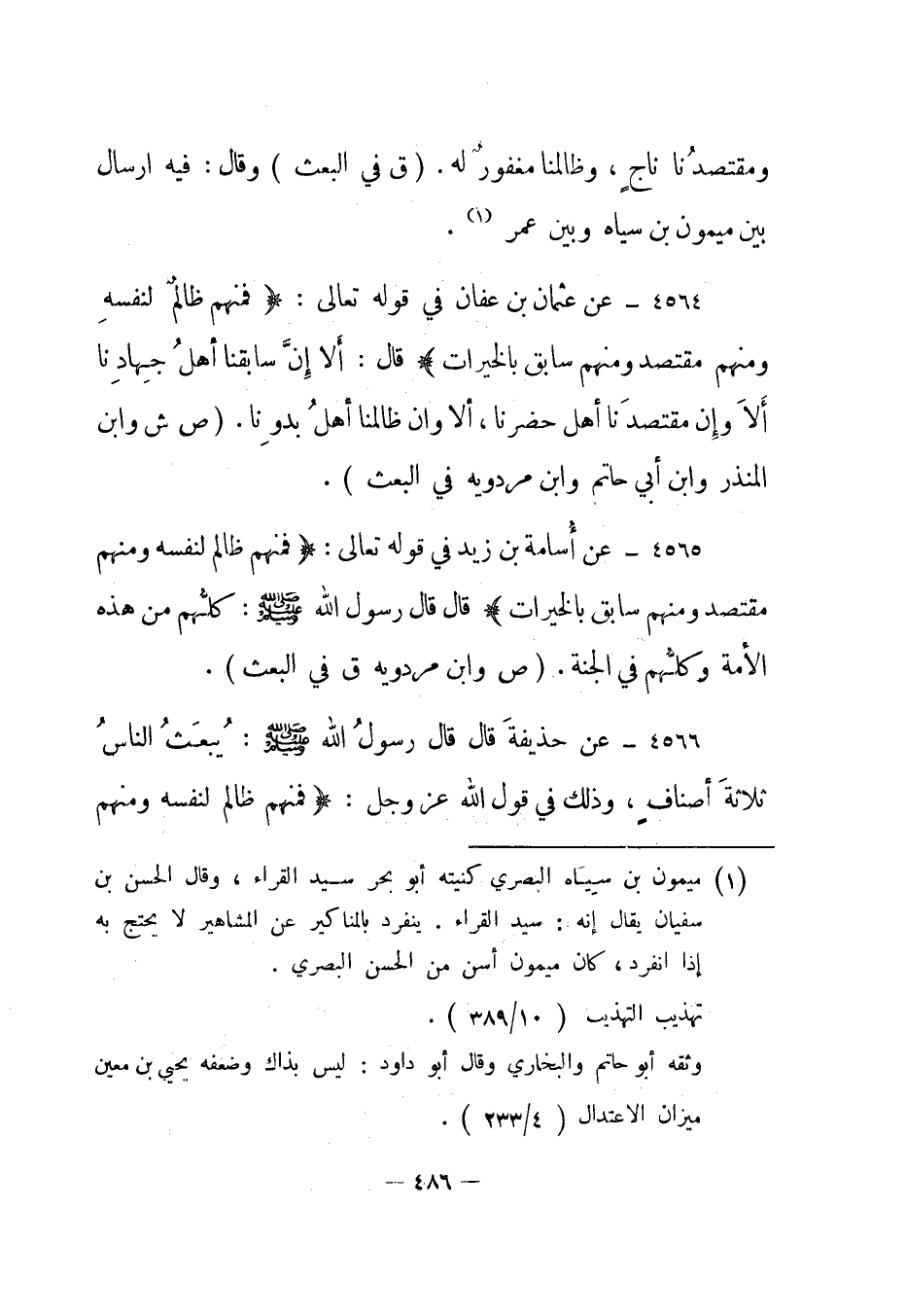 ومقتصدنا ناج، وظالمنا مغفور له". "ق في البعث" وقال: فيه إرسال بين ميمون بن سياه وبين عمر1.