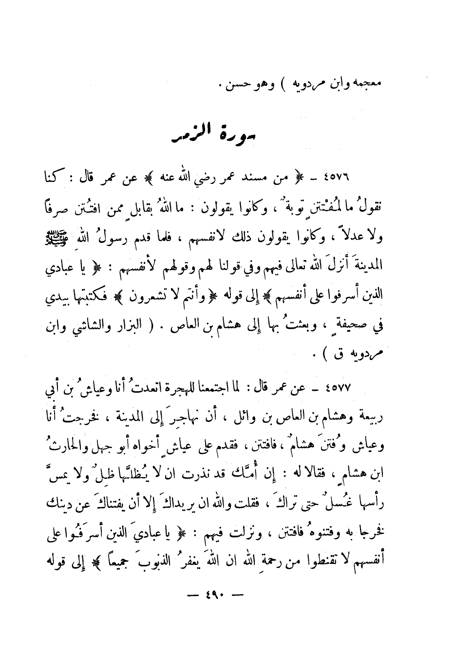 4576- "من مسند عمر رضي الله عنه" عن عمر قال: "كنا نقول ما لمفتتن توبة، وكانوا يقولون: ما الله بقابل ممن افتتن صرفا ولا عدلا، وكانوا يقولون ذلك لأنفسهم، فلما قدم رسول الله صلى الله عليه وسلم المدينة أنزل الله تعالى فيهم وفي قولنا لهم وقولهم لأنفسهم: {يَا عِبَادِيَ الَّذِينَ أَسْرَفُوا عَلَى أَنْفُسِهِمْ} إلى قوله {وَأَنْتُمْ لا تَشْعُرُونَ} فكتبتها بيدي في صحيفة، وبعثت بها إلى هشام بن العاص". "البزار والشاشي وابن مردويه ق".