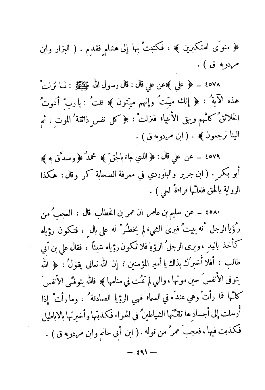 4580- عن سليم بن عامر أن عمر بن الخطاب قال: "العجب من رؤيا الرجل أنه يبيت فيرى الشيء لم يخطر له على بال، فتكون رؤياه كأخذ باليد، ويرى الرجل الرؤيا فلا تكون رؤياه شيئا، فقال علي بن أبي طالب: أفلا أخبرك بذاك يا أمير المؤمنين؟ إن الله تعالى يقول: {اللَّهُ يَتَوَفَّى الْأَنْفُسَ حِينَ مَوْتِهَا وَالَّتِي لَمْ تَمُتْ فِي مَنَامِهَا} فالله يتوفى الأنفس كلها فما رأت وهي عنده في السماء فهي الرؤيا الصادقة، وما رأت إذا أرسلت إلى أجسادها تلقتها الشياطين في الهواء فكذبتها وأخبرتها بالأباطيل فكذبت فيها، فعجب عمر من قوله. "ابن أبي حاتم وابن مردويه ق".