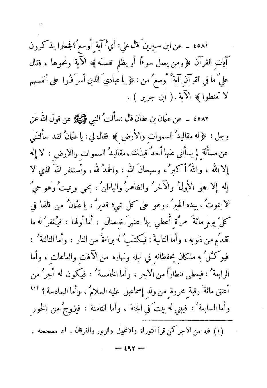 4581- عن ابن سيرين قال علي: "أي آية أوسع؟ فجعلوا يذكرون آيات القرآن {وَمَنْ يَعْمَلْ سُوءاً أَوْ يَظْلِمْ نَفْسَهُ} الآية ونحوها، فقال علي ما في القرآن أوسع من: {يَا عِبَادِيَ الَّذِينَ أَسْرَفُوا عَلَى أَنْفُسِهِمْ لا تَقْنَطُوا} " الآية. "ابن جرير".