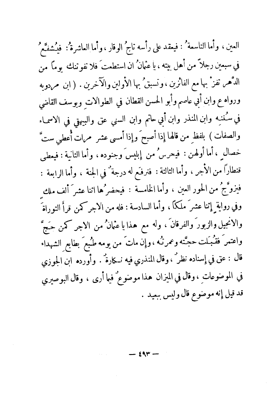 العين، وأما التاسعة: فيعقد على رأسه تاج الوقار، وأما العاشرة: فيشفع في سبعين رجلا من أهل بيته، يا عثمان إن استطعت فلا تفوتنك يوما من الدهر تفز مع الفائزين، وتسبق بها الأولين والآخرين". "ابن مردويه ورواه ع وابن أبي عاصم وأبو الحسن القطان في الطوالات ويوسف القاضي في سننه وابن المنذر وابن أبي حاتم وابن السني عق والبهقي في الأسماء والصفات" بلفظ من قالها إذا أصبح وإذا أمسى عشر مرات أعطي ست خصال، أما أولهن: فيحرس من إبليس وجنوده، وأما الثانية: فيعطى قنطارا من الأجر، وأما الثالثة: فترفع له درجة في الجنة، وأما الرابعة: فيزوج من الحور العين، وأما الخامسة: فيحضرها اثنا عشر ألف ملك وفي رواية إثنا عشر ملكا، وأما السادسة: فله من الأجر كمن قرأ التوراة والإنجيل والزبور والفرقان، وله مع هذا يا عثمان من الأجر كمن حج واعتمر فقبلت حجته وعمرته، وإن مات من يومه طبع بطابع الشهداء قال: عق في إسناده نظر، وقال المنذري فيه نكارة. وأورده ابن الجوزي في الموضوعات، وقال في الميزان هذا موضوع فيما أرى، وقال البوصيري قد قيل إنه موضوع قال وليس ببعيد.