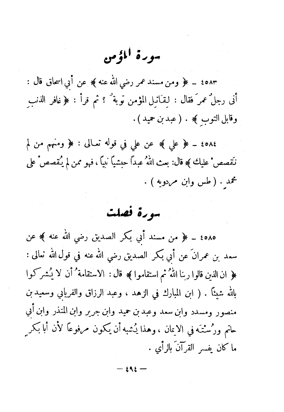 4583- "ومن مسند عمر رضي الله عنه" عن أبي إسحاق قال: أتى رجل عمر فقال: "لقاتل المؤمن توبة؟ ثم قرأ: {غَافِرِ الذَّنْبِ وَقَابِلِ التَّوْبِ} ". "عبد بن حميد".