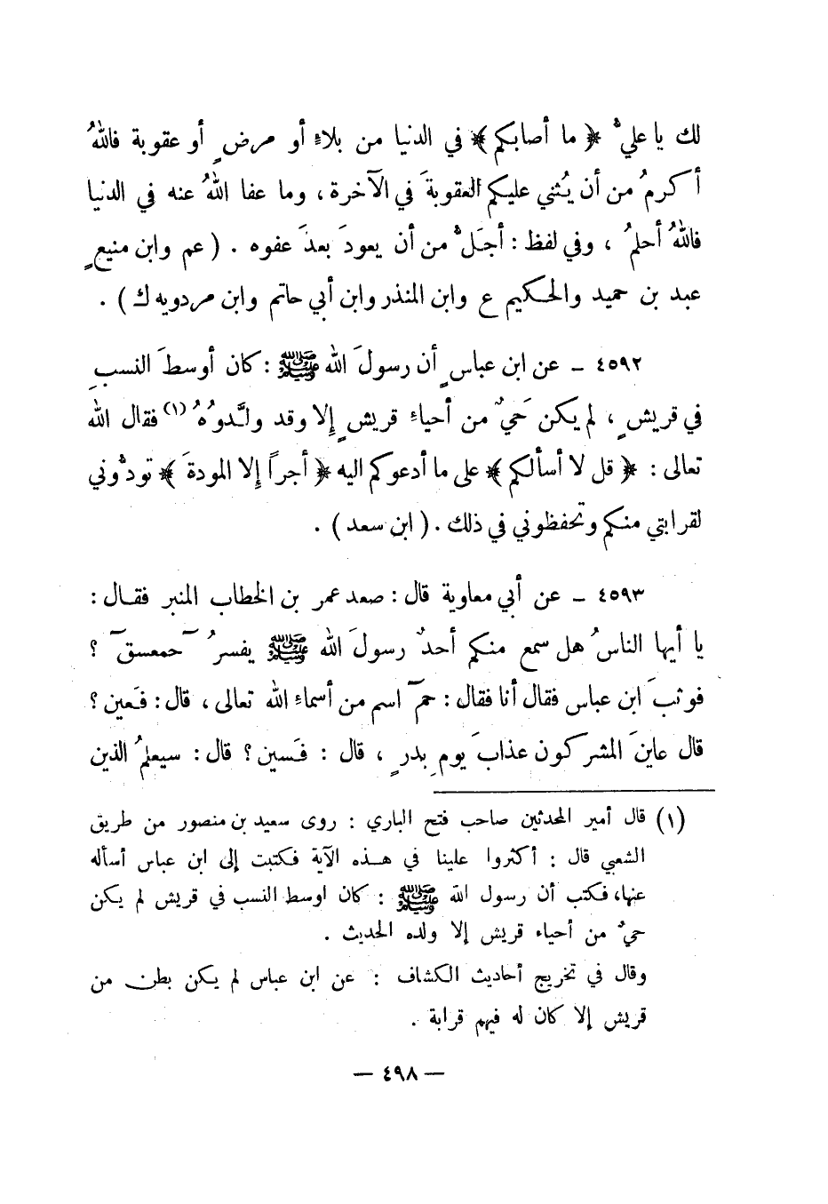 4592- عن ابن عباس أن رسول الله صلى الله عليه وسلم: "كان أوسط النسب في قريش، لم يكن حي من أحياء قريش إلا وقد ولدوه1 فقال الله تعالى: {قُلْ لا أَسْأَلُكُمْ} على ما أدعوكم إليه {أَجْراً إِلَّا الْمَوَدَّةَ} تودوني لقرابتي منكم وتحفظوني في ذلك". "ابن سعد".