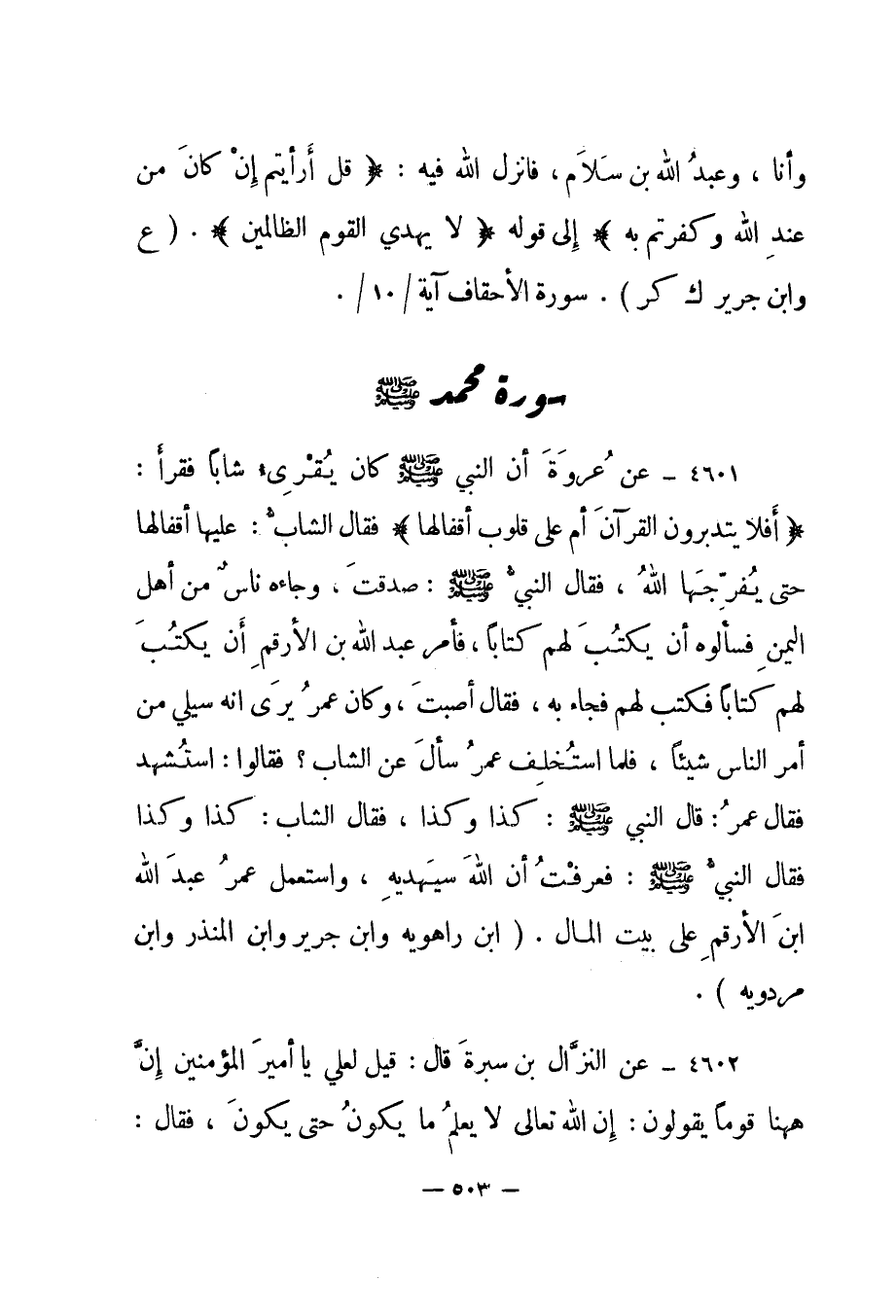 4601- عن عروة أن النبي صلى الله عليه وسلم كان يقرئ شابا فقرأ: " {أَفَلا يَتَدَبَّرُونَ الْقُرْآنَ أَمْ عَلَى قُلُوبٍ أَقْفَالُهَا} فقال الشاب: عليها أقفالها حتى يفرجها الله، فقال النبي صلى الله عليه سلم: صدقت، وجاءه ناس من أهل اليمن فسألوه أن يكتب لهم كتابا، فأمر عبد الله بن الأرقم أن يكتب لهم كتابا فكتب لهم فجاء به، فقال أصبت، وكان عمر يرى أنه سيلي من أمر الناس شيئا، فلما استخلف عمر سأل عن الشاب؟ فقالوا: استشهد فقال عمر: قال النبي صلى الله عليه وسلم: كذا وكذا، فقال الشاب: كذا وكذا فقال النبي صلى الله عليه وسلم: فعرفت أن الله سيهديه، واستعمل عمر عبد الله بن الأرقم على بيت المال". "ابن راهويه وابن جرير وابن المنذر وابن مردويه".