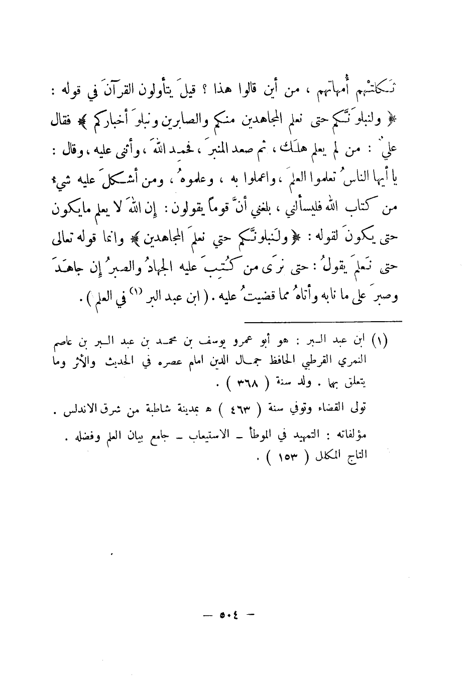 ثكلتهم أمهاتهم، من أين قالوا هذا؟ قيل يتأولون القرآن في قوله: {وَلَنَبْلُوَنَّكُمْ حَتَّى نَعْلَمَ الْمُجَاهِدِينَ مِنْكُمْ وَالصَّابِرِينَ وَنَبْلُوَ أَخْبَارَكُمْ} فقال علي: من لم يعلم هلك، ثم صعد المنبر، فحمد الله، وأثنى عليه، وقال: يا أيها الناس تعلموا العلم، واعملوا به، وعلموه، ومن أشكل عليه شيء من كتاب الله فليسألني، بلغني أن قوما يقولون: إن الله لا يعلم ما يكون حتى يكون لقوله: {وَلَنَبْلُوَنَّكُمْ حَتَّى نَعْلَمَ الْمُجَاهِدِينَ} وإنما قوله تعالى حتى نعلم يقول: حتى نرى من كتب عليه الجهاد والصبر إن جاهد وصبر على ما نابه وأتاه مما قضيت عليه". "ابن عبد البر1 في العلم".