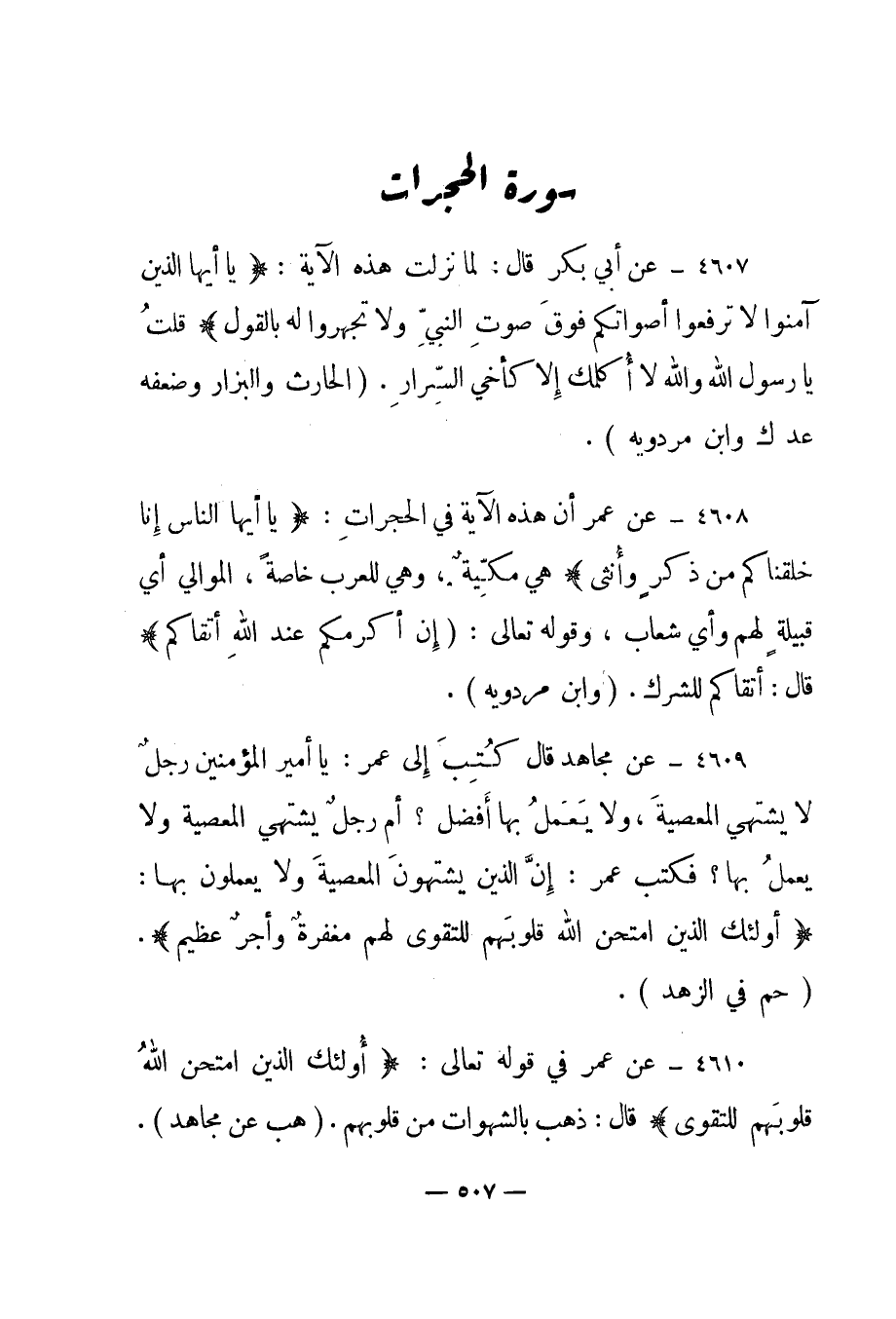 4610 - عن عمر في قوله تعالى: {أُولَئِكَ الَّذِينَ امْتَحَنَ اللَّهُ قُلُوبَهُمْ لِلتَّقْوَى} قال: "ذهب بالشهوات من قلوبهم"."هب عن مجاهد".