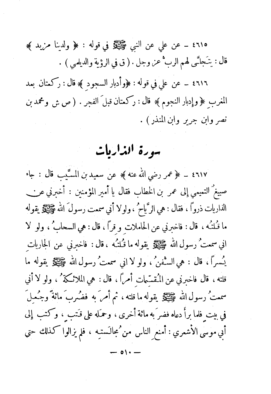 4617- "عمر رضي الله عنه" عن سعيد بن المسيب قال: جاء صبيغ التميمي إلى عمر بن الخطاب فقال يا أمير المؤمنين: "أخبرني عن الذاريات ذروا، فقال: هي الرياح، ولولا أني سمعت رسول الله صلى الله عليه وسلم يقوله ما قلته، قال: فأخبرني عن الحاملات وقرا، قال: هي السحاب، ولولا أني سمعت رسول الله صلى الله عليه وسلم يقوله ما قلته، قال: فأخبرني عن الجاريات يسرا، قال: هي السفن، ولولا أني سمعت رسول الله صلى الله عليه وسلم يقوله ما قلته، قال فأخبرني عن المقسمات أمرا، قال: هي الملائكة، ولولا أني سمعت رسول الله صلى الله عليه وسلم يقوله ما قلته، ثم أمر به فضرب مائة وجعل في بيت فلما برأ دعاه فضربه مائة أخرى، وحمله على قتب، وكتب إلى أبي موسى الأشعري: إمنع الناس من مجالسته، فلم يزالوا كذلك حتى
