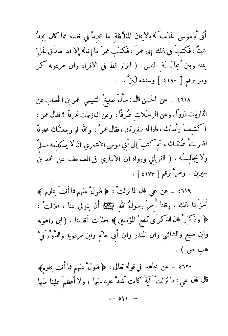 4618- عن الحسن قال: سأل صبيغ التميمي عمر بن الخطاب عن الذاريات ذروا، وعن المرسلات عرفا، وعن النازعات غرقا؟ فقال عمر: "اكشف رأسك، فإذا له ضفيرتان، فقال عمر: والله لو وجدتك محلوقا لضربت عنقك، ثم كتب إلى أبي موسى الأشعري أن لا يكلمه مسلم ولا يجالسه". "الفريابي ورواه ابن الأنباري في المصاحف عن محمد بن سيرين. ومر برقم [4173] ".