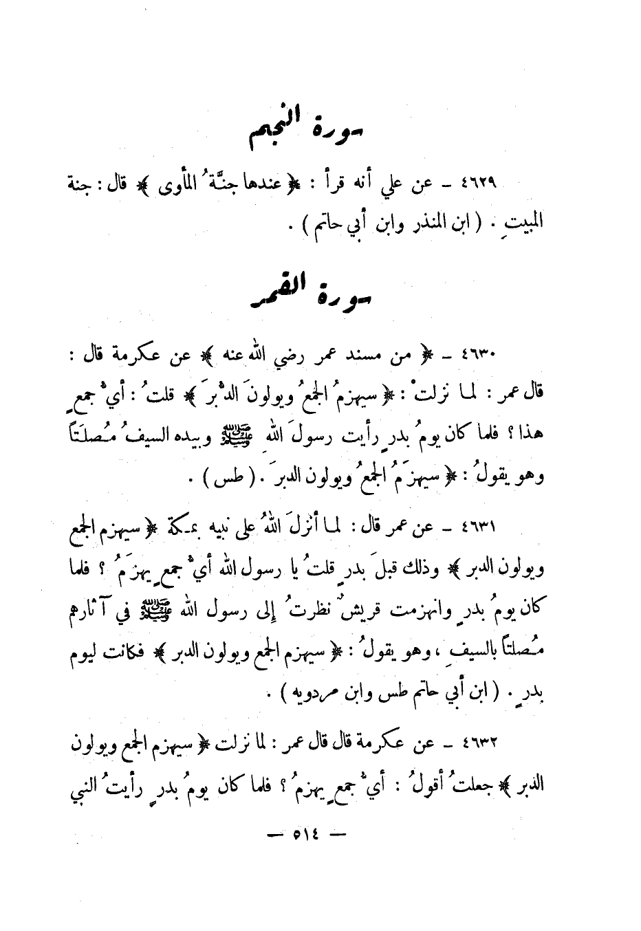 4630 – "من مسند عمر رضي الله عنه" عن عكرمة قال: قال عمر: لما نزلت: {سَيُهْزَمُ الْجَمْعُ وَيُوَلُّونَ الدُّبُرَ} قلت: أي جمع هذا؟ فلما كان يوم بدر رأيت رسول الله صلى الله عليه وسلم وبيده السيف مصلتا وهو يقول: {سَيُهْزَمُ الْجَمْعُ وَيُوَلُّونَ الدُّبُرَ} ."طس".