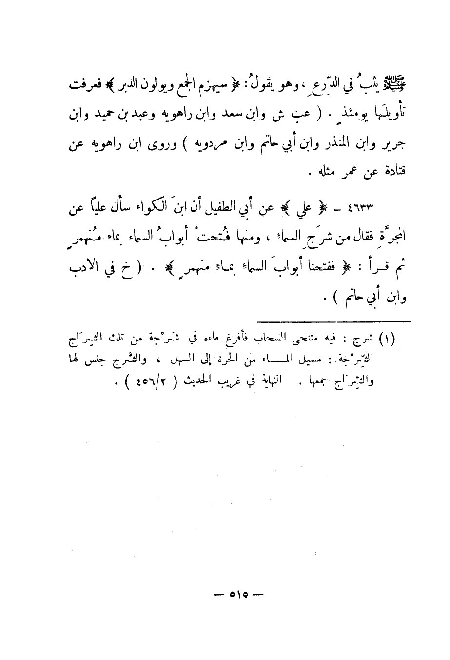 4633- "علي" عن أبي الطفيل أن ابن الكواء سأل عليا عن المجرة فقال من شرج1 السماء، ومنها فتحت أبواب السماء بماء منهمر ثم قرأ: {فَفَتَحْنَا أَبْوَابَ السَّمَاءِ بِمَاءٍ مُنْهَمِرٍ} ."خ في الأدب وابن أبي حاتم".