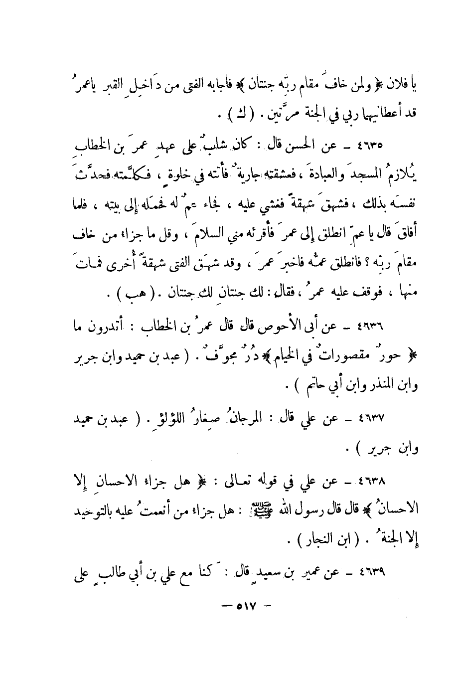 4635- عن الحسن قال: كان شاب على عهد عمر بن الخطاب يلازم المسجد والعبادة، فعشقته جارية فأتته في خلوة، فكلمته فحدث نفسه بذلك، فشهق شهقة فغشي عليه، فجاء عم له فحمله إلى بيته، فلما أفاق قال يا عم انطلق إلى عمر فأقرئه مني السلام، وقل ما جزاء من خاف مقام ربه؟ فانطلق عمه فأخبر عمر، وقد شهق الفتى شهقة أخرى فمات منها، فوقف عليه عمر، فقال: لك جنتان لك جنتان.