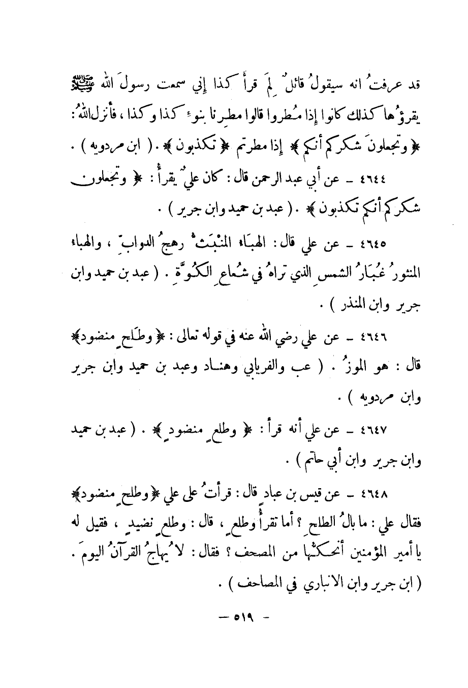 4648- عن قيس بن عباد قال: قرأت على علي {وَطَلْحٍ مَنْضُودٍ} فقال علي: "ما بال الطلح؟ أما تقرأ وطلع، قال: وطلع نضيد، فقيل له يا أمير المؤمنين أنحكها من المصحف؟ فقال: لا يهاج القرآن اليوم".