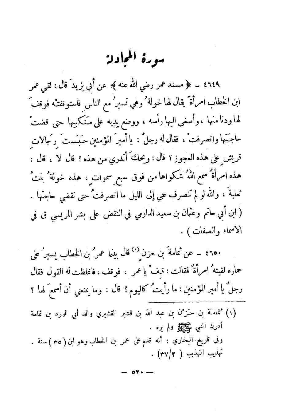 4649- "مسند عمر رضي الله عنه" عن أبي يزيد قال: لقي عمر بن الخطاب امرأة يقال لها خولة وهي تسير مع الناس فاستوقفته فوقف لها ودنا منها، وأصغى إليها رأسه، ووضع يديه على منكبيها حتى قضت حاجتها وانصرفت، فقال له رجل: يا أمير المؤمنين حبست رجالات قريش على هذه العجوز؟ قال: ويحك أتدري من هذه؟ قال لا، قال: هذه امرأة سمع الله شكواها من فوق سبع سموات، هذه خولة بنت ثعلبة، والله لو لم تنصرف عني إلى الليل ما انصرفت حتى تقضي حاجتها. "ابن أبي حاتم وعثمان بن سعيد الدارمي في النقض على بشر المريسي ق في الأسماء والصفات".