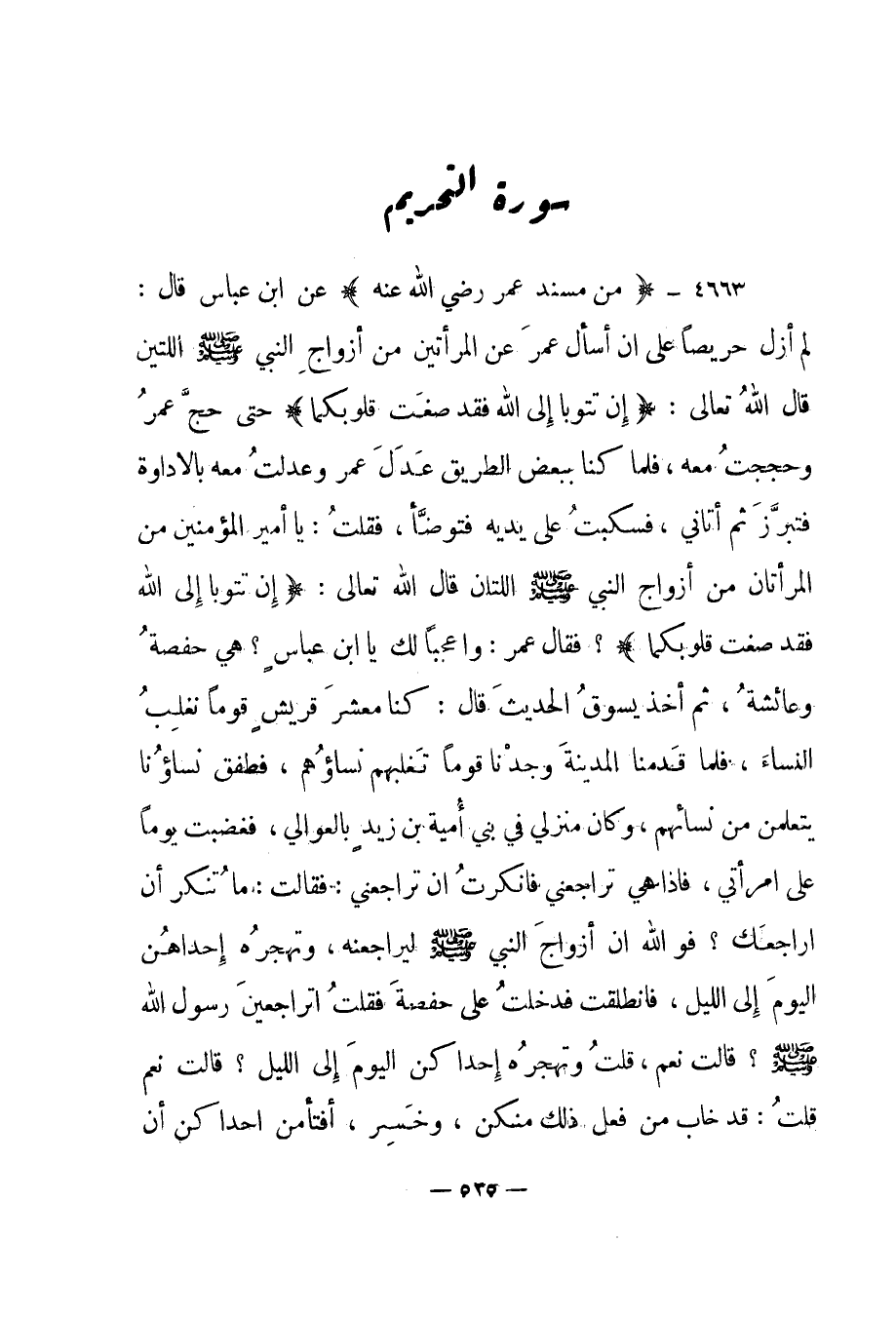 4663- "من مسند عمر رضي الله عنه" عن ابن عباس قال: لم أزل حريصا على أن أسأل عمر عن المرأتين من أزواج النبي صلى الله عليه وسلم اللتين قال الله تعالى: {إِنْ تَتُوبَا إِلَى اللَّهِ فَقَدْ صَغَتْ قُلُوبُكُمَا} حتى حج عمر وحججت معه، فلما كنا ببعض الطريق عدل عمر وعدلت معه بالإداوة فتبرز ثم أتاني، فسكبت على يديه ثم توضأ، فقلت: يا أمير المؤمنين من المرأتان من أزواج النبي صلى الله عليه وسلم اللتان قال الله تعالى: {إِنْ تَتُوبَا إِلَى اللَّهِ فَقَدْ صَغَتْ قُلُوبُكُمَا} ؟ فقال عمر: "وا عجبا لك يا ابن عباس؟ هي حفصة وعائشة، ثم أخذ يسوق الحديث قال: كنا معشر قريش قوما نغلب النساء، فلما قدمنا المدينة وجدنا قوما تغلبهم نساؤهم، فطفق نساؤنا يتعلمن من نسائهم، وكان منزلي في بني أمية بن زيد بالعوالي، فغضبت يوما على امرأتي، فإذا هي تراجعني فأنكرت أن تراجعني: فقالت: ما تنكر أن أراجعك؟ فوالله إن أزواج النبي صلى الله عليه وسلم ليراجعنه، وتهجره إحداهن اليوم إلى الليل، فانطلقت فدخلت على حفصة فقلت أتراجعين رسول الله صلى الله عليه وسلم؟ قالت نعم، قلت وتهجره إحداكن اليوم إلى الليل؟ قالت نعم قلت: قد خاب من فعل ذلك منكن، وخسر، أفتأمن إحداكن أن