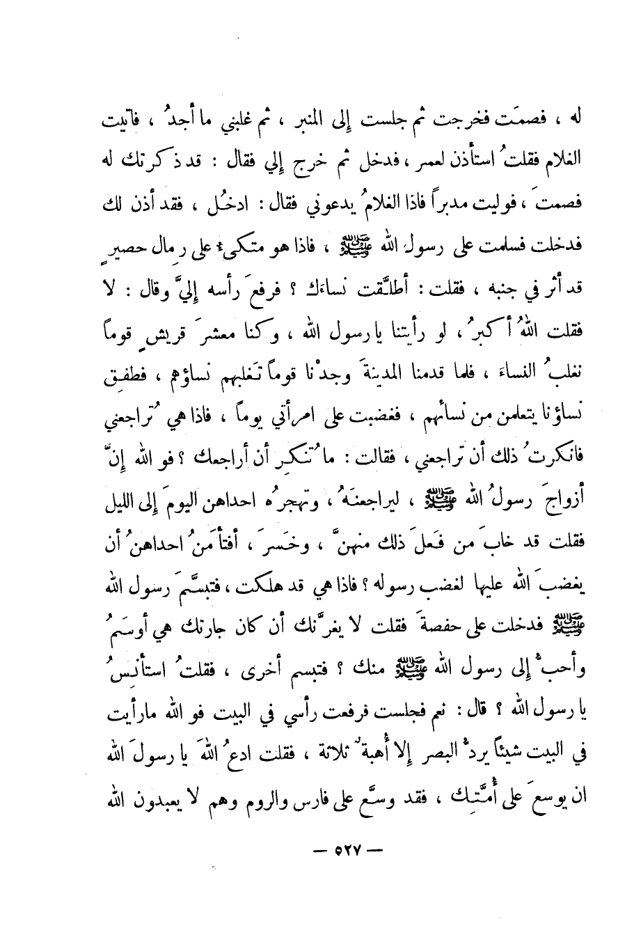 له، فصمت فخرجت ثم جلست إلى المنبر، ثم غلبني ما أجد، فأتيت الغلام فقلت استأذن لعمر، فدخل ثم خرج إلي فقال: قد ذكرتك له فصمت، فوليت مدبرا فإذا الغلام يدعوني فقال: ادخل، فقد أذن لك فدخلت فسلمت على رسول الله صلى الله عليه وسلم، فإذا هو متكئ على رمال حصير قد أثر في جنبه، فقلت: أطلقت نساءك؟ فرفع رأسه إلي وقال: لا فقلت الله أكبر، لو رأيتنا يا رسول الله، وكنا معشر قريش قوما نغلب النساء، فلما قدمنا المدينة وجدنا قوما تغلبهم نساؤهم، فطفق نساؤنا يتعلمن من نسائهم، فغضبت على امرأتي يوما، فإذا هي تراجعني فأنكرت ذلك أن تراجعني، فقالت: ما تنكر أن أراجعك؟ فوالله إن أزواج رسول الله صلى الله عليه سلم، ليراجعنه، وتهجره إحداهن اليوم إلى الليل فقلت قد خاب من فعل ذلك منهن، وخسر، أفتأمن إحداهن أن يغضب الله عليها لغضب رسوله؟ فإذا هي قد هلكت فتبسم رسول الله صلى الله عليه وسلم فدخلت على حفصة فقلت لا يغرنك أن كان جارتك هي أوسم وأحب إلى رسول الله صلى الله عليه وسلم منك؟ فتبسم أخرى، فقلت أستأنس يا رسول الله؟ قال: نعم فجلست فرفعت رأسي في البيت فوالله ما رأيت في البيت شيئا يرد البصر إلا أهبة ثلاثة، فقلت ادع الله يا رسول الله أن يوسع على أمتك، فقد وسع على فارس والروم وهم لا يعبدون الله