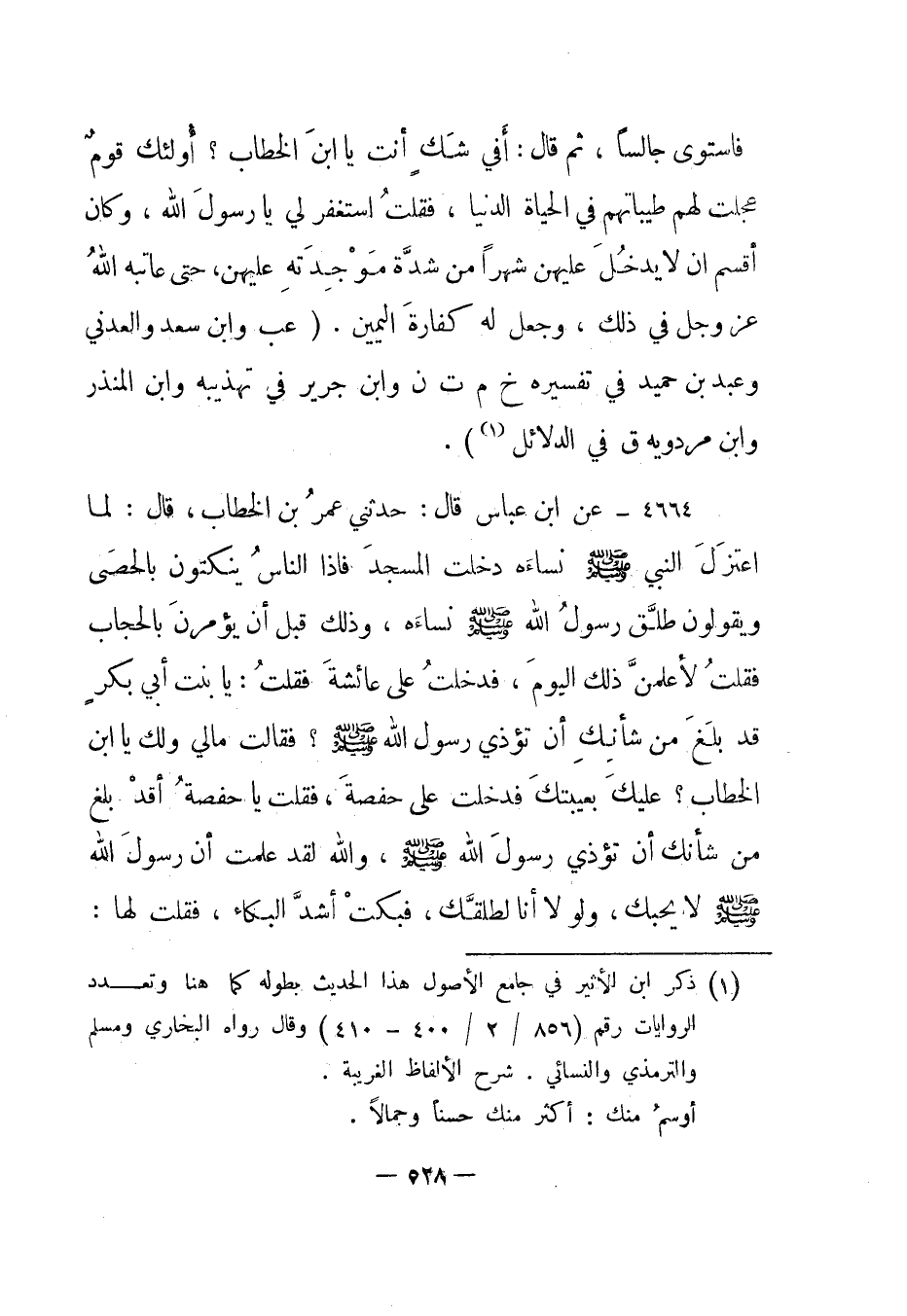 فاستوى جالسا، ثم قال: "أفي شك أنت يا ابن الخطاب؟ أولئك قوم عجلت لهم طيباتهم في الحياة الدنيا"، فقلت استغفر لي يا رسول الله، وكان أقسم أن لا يدخل عليهن شهرا من شدة موجدته عليهن، حتى عاتبه الله عز وجل في ذلك، وجعل له كفارة اليمين". "عب وابن سعد والعدني وعبد بن حميد في تفسيره خ م ت ن وابن جرير في تهذيبه وابن المنذر وابن مردويه ق في الدلائل1.