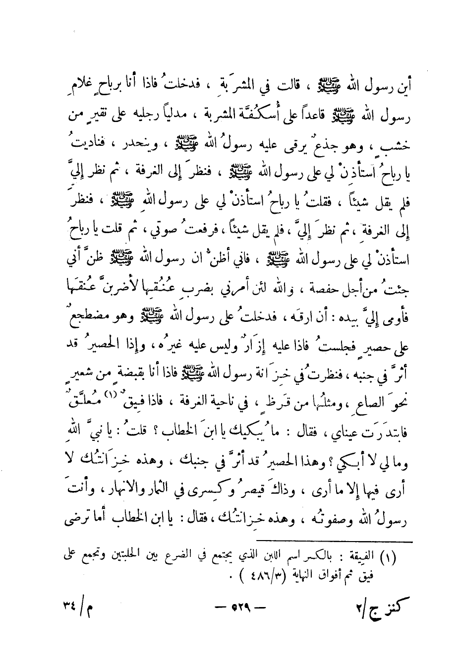 أين رسول الله صلى الله عليه وسلم، قالت في المشربة، فدخلت فإذا أنا برباح غلام رسول الله صلى الله عليه وسلم قاعدا على أسكفة المشربة، مدليا رجليه على نقير من خشب، وهو جذع يرقى عليه رسول الله صلى الله عليه وسلم، وينحدر، فناديت يا رباح استأذن لي على رسول الله صلى الله عليه وسلم، فنظر إلى الغرفة، ثم نظر إلي فلم يقل شيئا، فقلت يا رباح استأذن لي على رسول الله صلى الله عليه وسلم، فنظر إلى الغرفة، ثم نظر إلي، فلم يقل شيئا، فرفعت صوتي، ثم قلت يا رباح استأذن لي على رسول الله صلى الله عليه وسلم، فإني أظن أن رسول الله صلى الله عليه وسلم ظن أني جئت من أجل حفصة، والله لئن أمرني بضرب عنقها لأضربن عنقها فأومأ إلي بيده: أن ارقه، فدخلت على رسول الله صلى الله عليه وسلم وهو مضطجع على حصير فجلست فإذا عليه إزار وليس عليه غيره، وإذا الحصير قد أثر في جنبه، فنظرت في خزانة رسول الله صلى الله عليه وسلم فإذا أنا بقبضة من شعير نحو الصاع، ومثلها من قرظ، في ناحية الغرفة، فإذا فيق1 معلق فابتدرت عيناي، فقال: ما يبكيك يا ابن الخطاب؟ قلت: يا نبي الله وما لي لا أبكي؟ وهذا الحصير قد أثر في جنبك، وهذه خزانتك لا أرى فيها إلا ما أرى، وذاك قيصر وكسرى في الثمار والأنهار، وأنت رسول الله وصفوته، وهذه خزانتك، فقال: يا ابن الخطاب أما ترضى