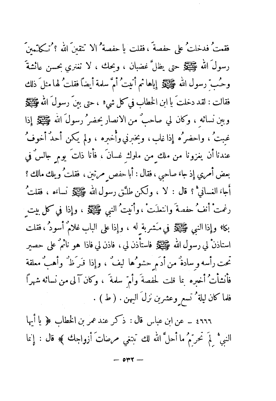 4666- عن ابن عباس قال: ذكر عند عمر بن الخطاب {يَا أَيُّهَا النَّبِيُّ لِمَ تُحَرِّمُ مَا أَحَلَّ اللَّهُ لَكَ تَبْتَغِي مَرْضَاتَ أَزْوَاجِكَ} قال: "إنما