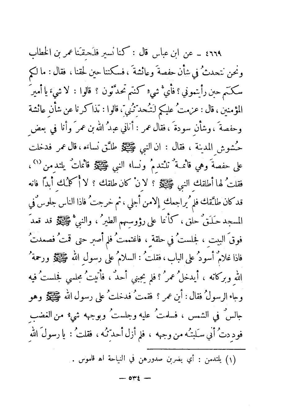 4669- عن ابن عباس قال: كنا نسير فلحقنا عمر بن الخطاب ونحن نتحدث في شأن حفصة وعائشة، فسكتنا حين لحقنا، فقال: ما لكم سكتم حين رأيتموني؟ فأي شيء كنتم تحدثون؟ قالوا: لا شيء يا أمير المؤمنين، قال: عزمت عليكم لتحدثني، قالوا: تذاكرنا عن شأن عائشة وحفصة، وشأن سودة، فقال عمر: أتاني عبد الله بن عمر وأنا في بعض حشوش المدينة، فقال: إن النبي صلى الله عليه وسلم طلق نساءه، قال عمر فدخلت على حفصة وهي قائمة تلتدم ونساء النبي صلى الله عليه وسلم قائمات يلتدمن1 فقلت لها أطلقك النبي صلى الله عليه وسلم؟ لإن كان طلقك لا أكلمك أبدا فإنه قد كان طلقك فلم يراجعك إلا من أجلي، ثم خرجت فإذا الناس جلوس في المسجد حلق حلق، كأنما على رؤوسهم الطير، والنبي صلى الله عليه وسلم قد قعد فوق البيت، فجلست في حلقة، فاغتممت فلم أصبر حتى قمت فصعدت فإذا غلام أسود على الباب، فقلت: السلام على رسول الله صلى الله عليه وسلم ورحمة الله وبركاته، أيدخل عمر؟ فلم يجبني أحد، فأتيت مجلسي فجلست فيه وجاء الرسول فقال: أين عمر؟ فقمت فدخلت على رسول الله صلى الله عليه وسلم وهو جالس في الشمس، فسلمت عليه وجلست وبوجهه شيء من الغضب فوددت أني سلبته من وجهه، فلم أزل أحدثه، فقلت: يا رسول الله