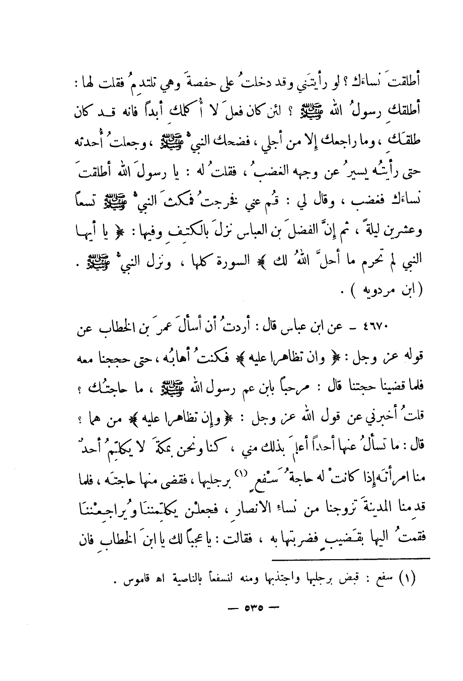 4670- عن ابن عباس قال: أردت أن أسأل عمر بن الخطاب عن قوله عز وجل: {وَإِنْ تَظَاهَرَا عَلَيْهِ} فكنت أهابه، حتى حججنا معه فلما قضينا حجتنا قال: مرحبا بابن عم رسول الله صلى الله عليه وسلم، ما حاجتك؟ قلت أخبرني عن قول الله عز وجل: {وإن تظاهرا عليه} من هما؟ قال: ما تسأل عنها أحدا أعلم بذلك مني، كنا ونحن بمكة لا يكلم أحد منا امرأته إذا كانت له حاجة سفع1 برجليها، فقضى منها حاجته فلما قدمنا المدينة تزوجنا من نساء الأنصار، فجعلن يكلمننا ويراجعننا فقمت إليها بقضيب فضربتها به، فقالت: يا عجبا لك يا ابن الخطاب فإن