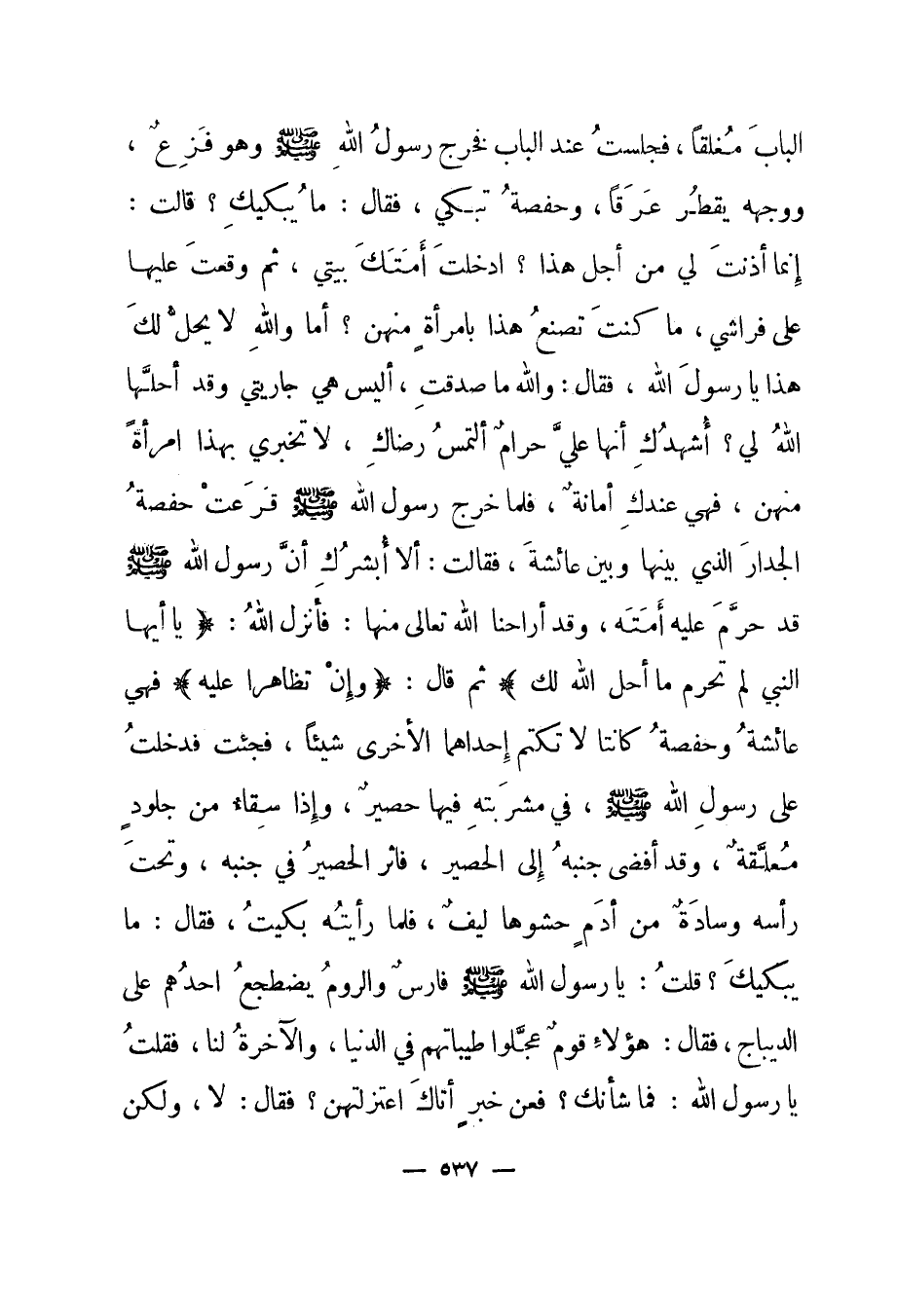 الباب مغلقا، فجلست عند الباب فخرج رسول الله صلى الله عليه وسلم وهو فزع، ووجهه يقطر عرقا، وحفصة تبكي، فقال: ما يبكيك؟ قالت: إنما أذنت لي من أجل هذا؟ أدخلت أمتك بيتي، ثم وقعت عليها على فراشي، ما كنت تصنع هذا بامرأة منهن؟ أما والله لا يحل لك هذا يا رسول الله، فقال: والله ما صدقت، أليس هي جاريتي وقد أحلها الله لي؟ أشهدك أنها علي حرام ألتمس رضاك، لا تخبري بهذا امرأة منهن، فهي عندك أمانة فلما خرج رسول الله صلى الله عليه وسلم قرعت حفصة الجدار الذي بينها وبين عائشة، فقالت: ألا أبشرك أن رسول الله صلى الله عليه وسلم قد حرم عليه أمته، وقد أراحنا الله تعالى منها: فأنزل الله: {يَا أَيُّهَا النَّبِيُّ لِمَ تُحَرِّمُ مَا أَحَلَّ اللَّهُ لَكَ} ثم قال: {وَإِنْ تَظَاهَرَا عَلَيْهِ} فهي عائشة وحفصة كانتا لا تكتم إحداهما الأخرى شيئا، فجئت فدخلت على رسول الله صلى الله عليه وسلم، في مشربته فيها حصير، وإذا سقاء من جلود معلقة، وقد أفضى جنبه إلى الحصير، فأثر الحصير في جنبه، وتحت رأسه وسادة من أدم حشوها ليف، فلما رأيته بكيت، فقال: ما يبكيك؟ قلت: يا رسول الله صلى الله عليه وسلم فارس والروم يضطجع أحدهم على الديباج، فقال: هؤلاء قوم عجلوا طيباتهم في الدنيا، والآخرة لنا، فقلت يا رسول الله: فما شأنك؟ فعن خبر أتاك اعتزلتهن؟ فقال: لا، ولكن