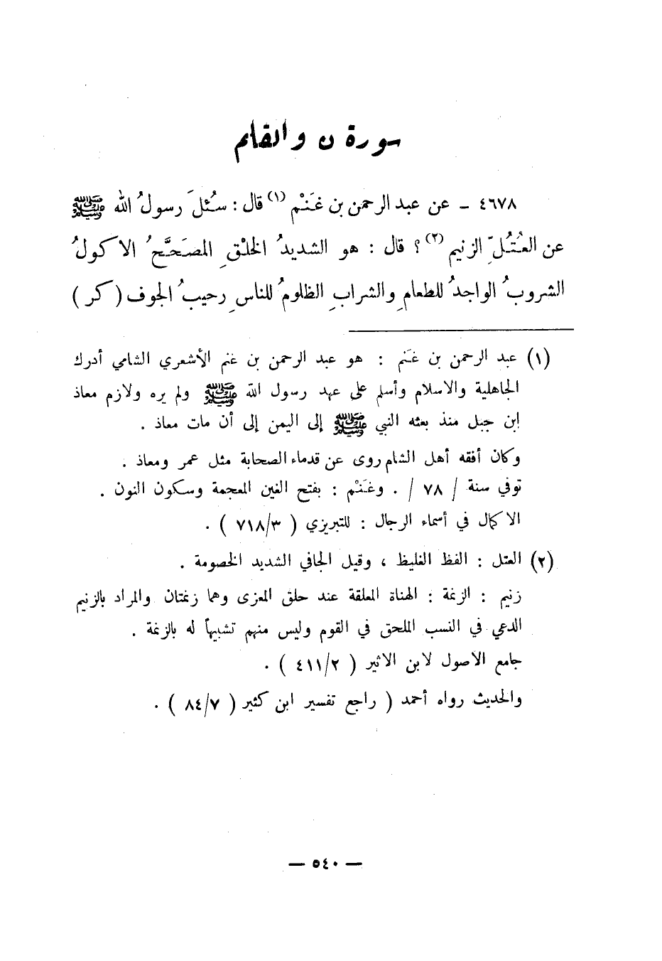4678- عن عبد الرحمن بن غنم1 قال: سئل رسول الله صلى الله عليه وسلم عن العتل الزنيم2؟ قال: "هو الشديد الخلق المصحح الأكول الشروب الواجد للطعام والشراب الظلوم للناس رحيب الجوف". "كر".