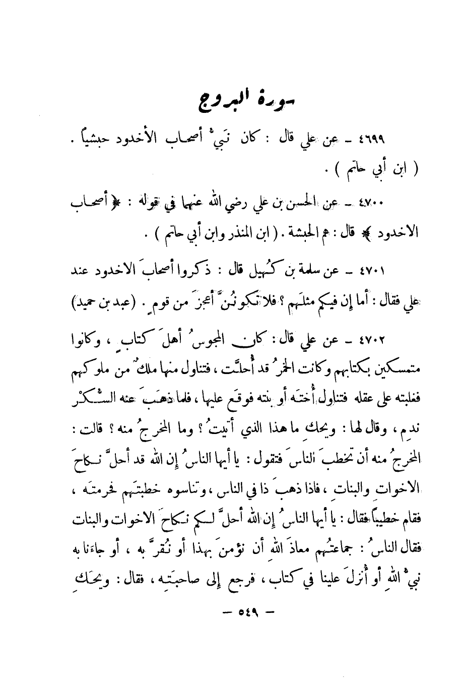 4701- عن سلمة بن كهيل قال: ذكروا أصحاب الأخدود عند علي فقال: "أما إن فيكم مثلهم؟ فلا تكونن أعجز من قوم". "عبد بن حميد".