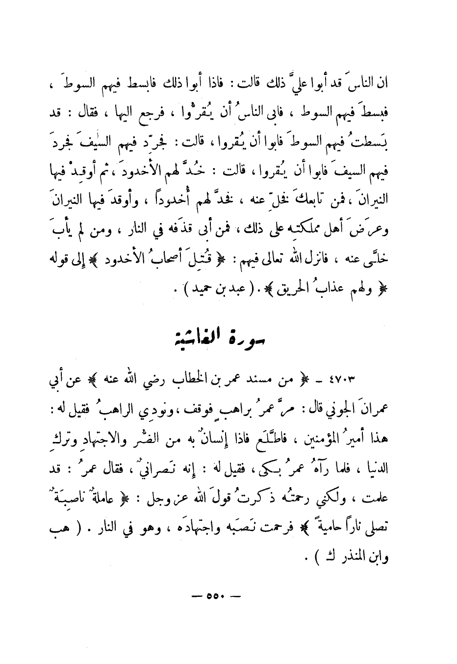 4703- "من مسند عمر بن الخطاب رضي الله عنه" عن أبي عمران الجوني قال: مر عمر براهب فوقف، ونودي الراهب فقيل له: هذا أمير المؤمنين، فاطلع فإذا إنسان به من الضر والاجتهاد وترك الدنيا، فلما رآه عمر بكى، فقيل له: إنه نصراني، فقال عمر: قد علمت، ولكني رحمته ذكرت قول الله عز وجل: {عَامِلَةٌ نَاصِبَةٌ تَصْلَى نَاراً حَامِيَةً} فرحمت نصبه واجتهاده، وهو في النار. "هب وابن المنذر ك".