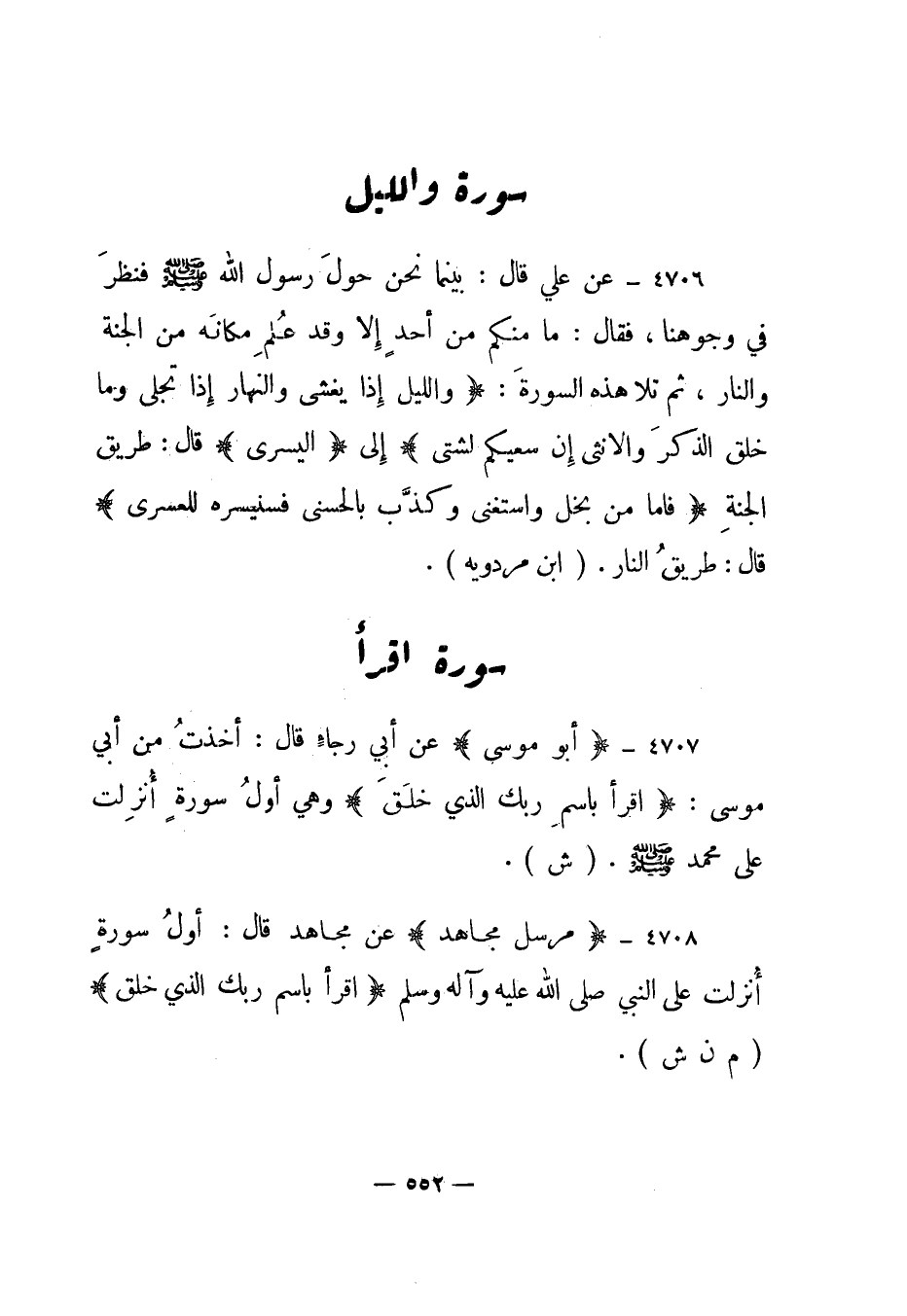 4706- عن علي قال: بينما نحن حول رسول الله صلى الله عليه وسلم فنظر في وجوهنا، فقال: " ما منكم من أحد إلا وقد علم مكانه من الجنة والنار"، ثم تلا هذه السورة: {وَاللَّيْلِ إِذَا يَغْشَى وَالنَّهَارِ إِذَا تَجَلَّى وَمَا خَلَقَ الذَّكَرَ وَالْأُنْثَى إِنَّ سَعْيَكُمْ لَشَتَّى} إلى {لِلْيُسْرَى} قال: "طريق الجنة" {وَأَمَّا مَنْ بَخِلَ وَاسْتَغْنَى وَكَذَّبَ بِالْحُسْنَى فَسَنُيَسِّرُهُ لِلْعُسْرَى} قال: "طريق النار". "ابن مردويه".