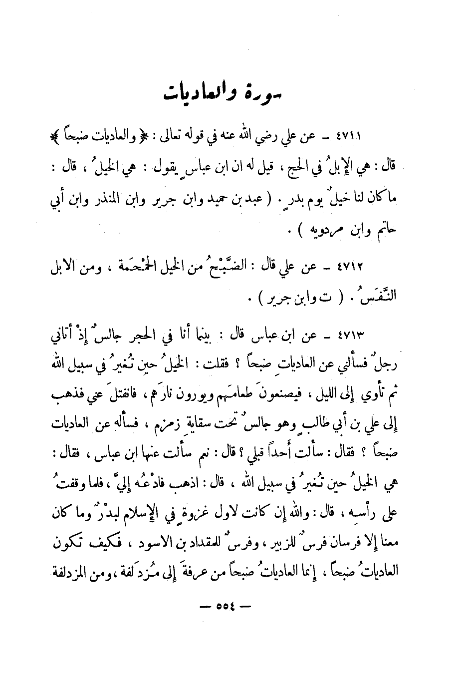 4713- عن ابن عباس قال: بينما أنا في الحجر جالس إذ أتاني رجل فسألني عن العاديات ضبحا؟ فقلت: الخيل حين تغير في سبيل الله ثم تأوي إلى الليل، فيصنعون طعامهم ويورون نارهم، فانفتل عني فذهب إلى علي بن أبي طالب وهو جالس تحت سقاية زمزم، فسأله عن العاديات ضبحا؟ فقال: سألت أحدا قبلي؟ قال: نعم سألت عنها ابن عباس، فقال: هي الخيل حين تغير في سبيل الله، قال: اذهب فأدعه إلي، فلما وقفت على رأسه، قال: والله إن كانت لأول غزوة في الإسلام لبدر وما كان معنا إلا فرسان فرس للزبير، وفرس للمقداد بن الأسود، فكيف تكون العاديات ضبحا، إنما العاديات ضبحا من عرفة إلى مزدلفة، ومن المزدلفة