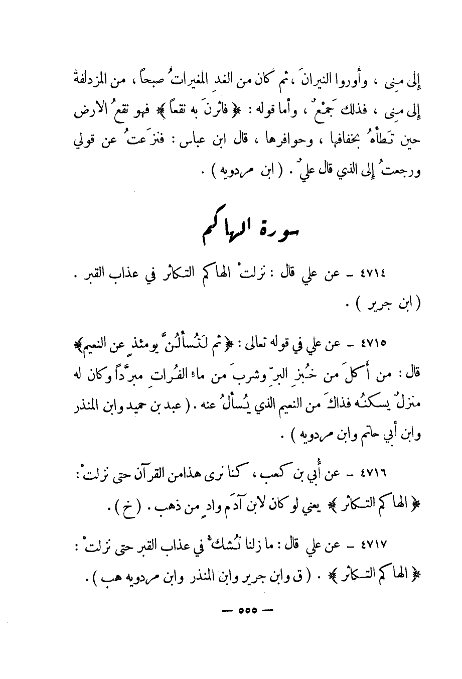 4717- عن علي قال: ما زلنا نشك في عذاب القبر حتى نزلت: {أَلْهَاكُمُ التَّكَاثُرُ} . "ق وابن جرير وابن المنذر وابن مردويه هب".