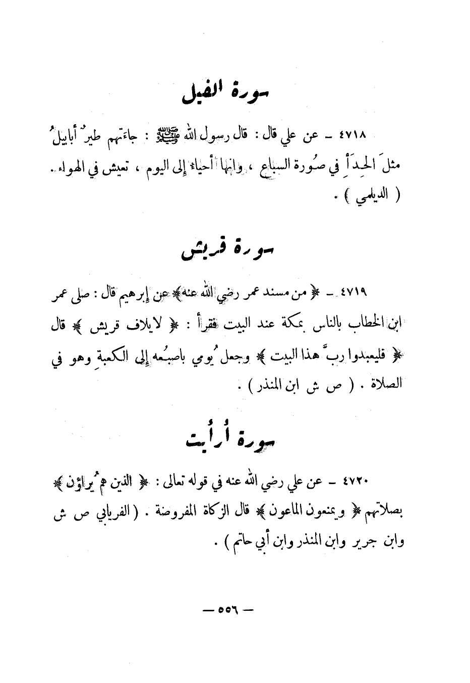 4719- "من مسند عمر رضي الله عنه" عن إبراهيم قال: صلى عمر ابن الخطاب بالناس بمكة عند البيت فقرأ: {لِإِيلافِ قُرَيْشٍ} قال {فَلْيَعْبُدُوا رَبَّ هَذَا الْبَيْتِ} وجعل يومي بإصبعه إلى الكعبة وهو في الصلاة. "ص ش ابن المنذر".