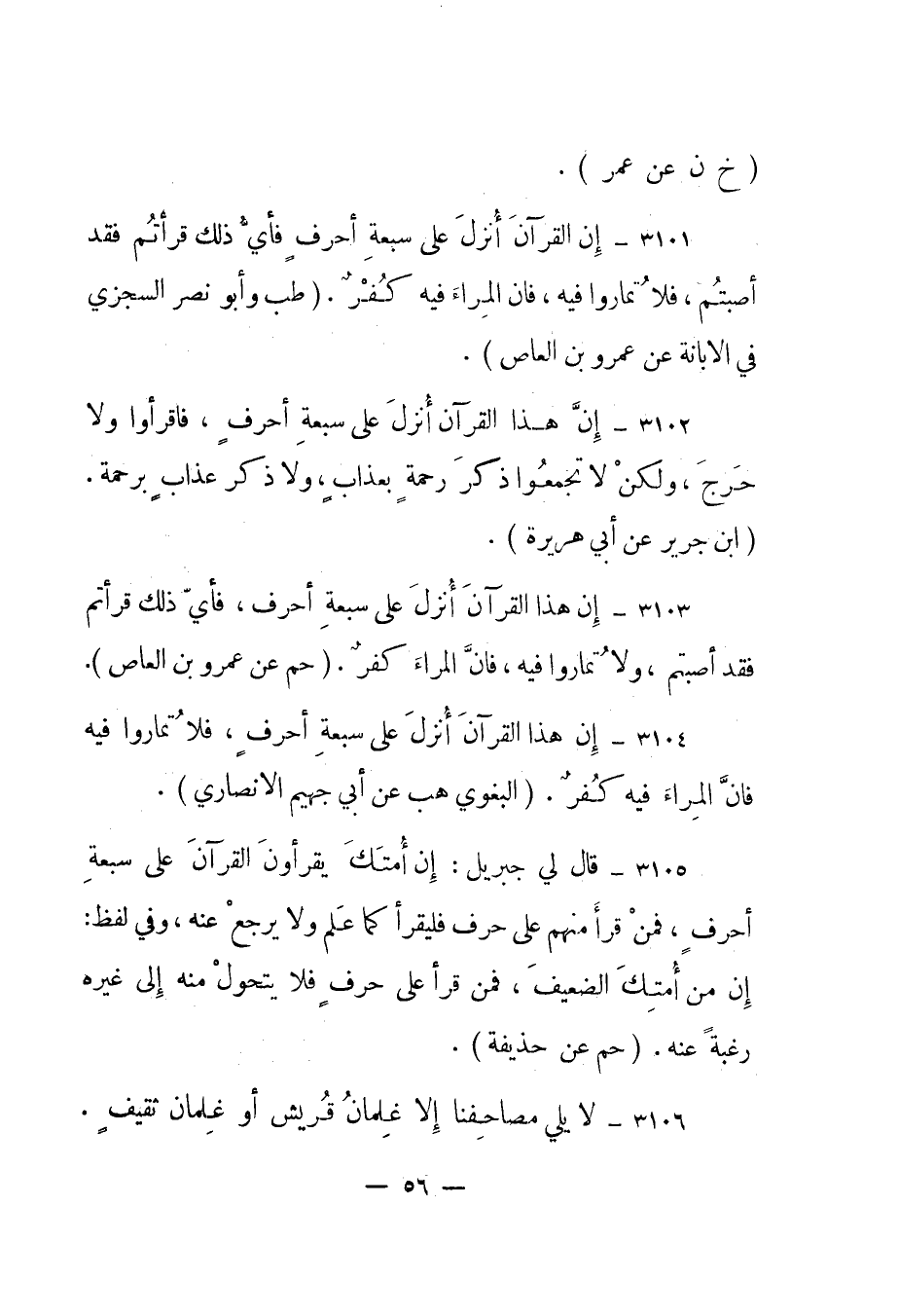 3104- "إن هذا القرآن أنزل على سبعة أحرف، فلا تماروا فيه فإن المراء فيه كفر". "البغوي هب عن أبي جهيم الأنصاري".