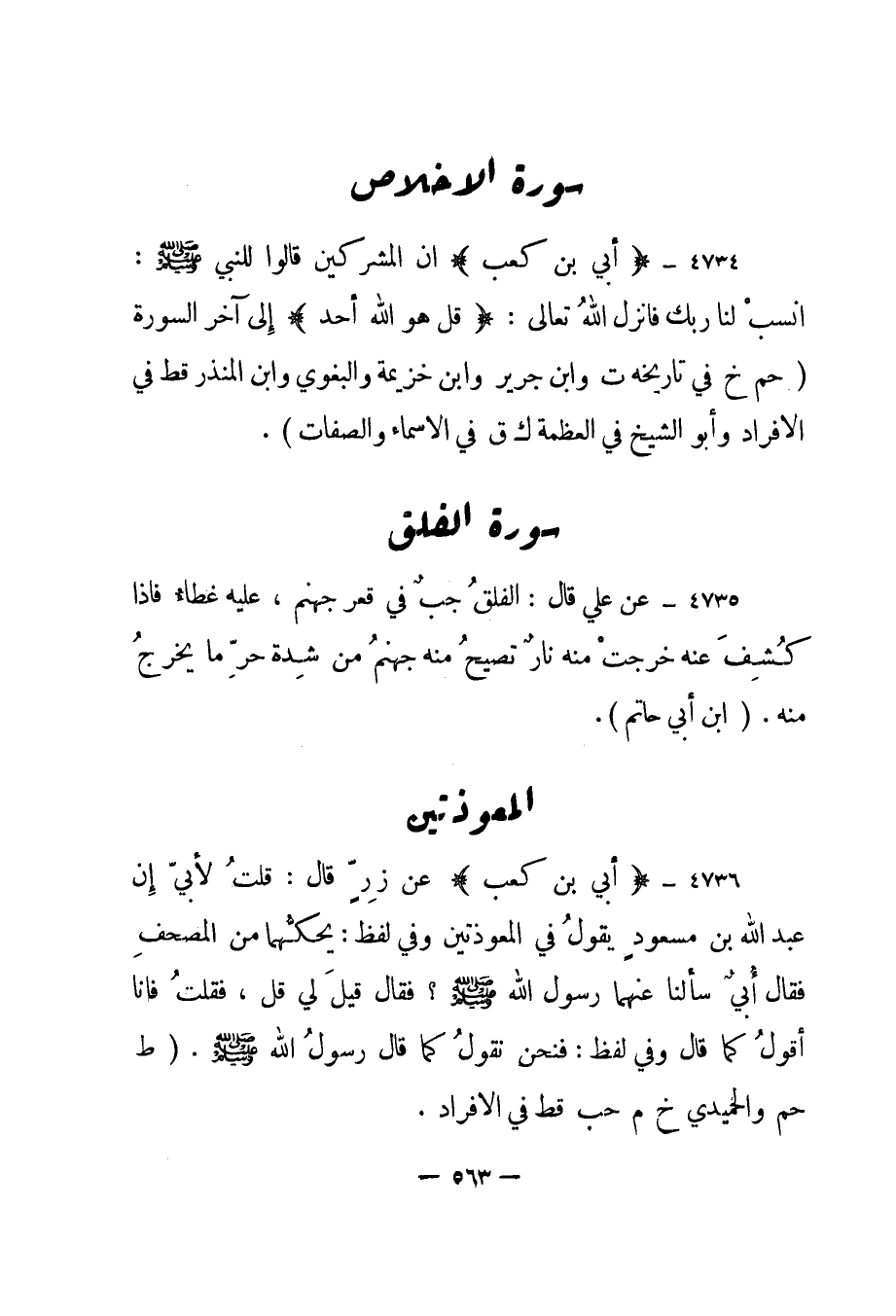 4734- "أبي بن كعب" إن المشركين قالوا للنبي صلى الله عليه وسلم: "انسب لنا ربك فأنزل الله تعالى: {قُلْ هُوَ اللَّهُ أَحَدٌ} إلى آخر السورة". "حم خ في تاريخه ت وابن جرير وابن خزيمة والبغوي وابن المنذر قط في الأفراد وأبو الشيخ في العظمة ك ق في الأسماء والصفات".