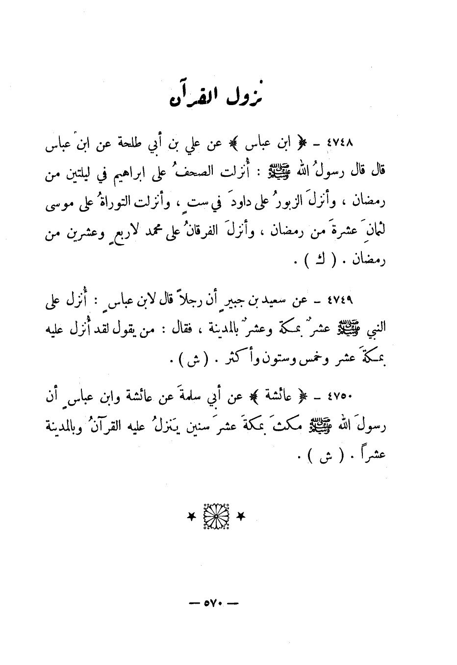 4749- عن سعيد بن جبير أن رجلا قال لابن عباس: "أنزل على النبي صلى الله عليه وسلم عشر بمكة وعشر بالمدينة" فقال: "من يقول لقد أنزل عليه بمكة عشر وخمس وستون وأكثر". "ش".
