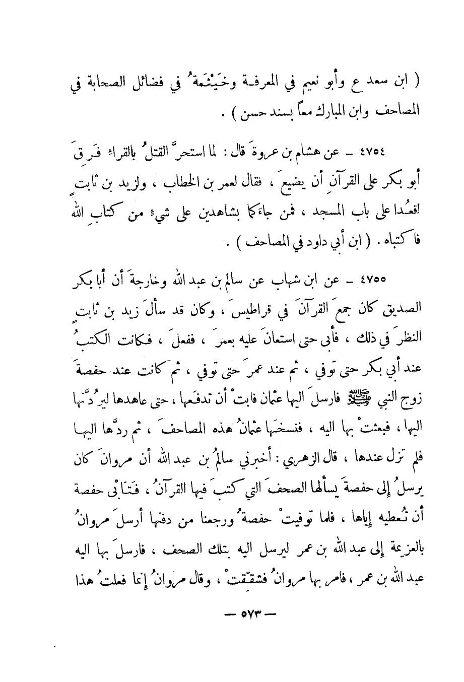 4754- عن هشام بن عروة قال: "لما استحر القتل بالقراء فرق أبو بكر على القرآن أن يضيع، فقال لعمر بن الخطاب، ولزيد بن ثابت اقعدا على باب المسجد، فمن جاءكما بشاهدين على شيء من كتاب الله فاكتباه". "ابن أبي داود في المصاحف".