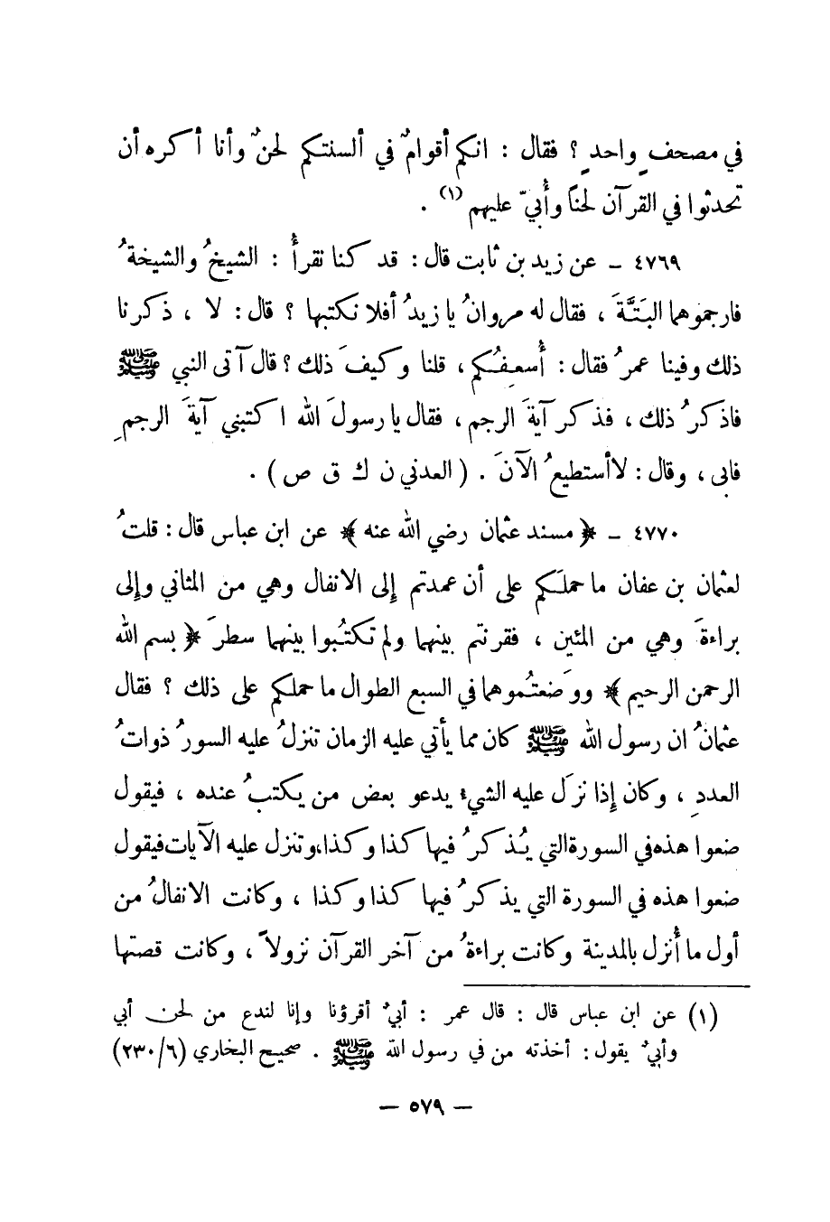 4770- "مسند عثمان رضي الله عنه" عن ابن عباس قال: "قلت لعثمان ابن عفان ما حملكم على أن عمدتم إلى الأنفال وهي من المثاني وإلى براءة وهي من المئين، فقرنتم بينهما ولم تكتبوا بينهما سطر {بِسْمِ اللَّهِ الرَّحْمَنِ الرَّحِيمِ} ووضعتموهما في السبع الطوال ما حملكم على ذلك؟ فقال عثمان "ان رسول الله صلى الله عليه وسلم كان مما يأتي عليه الزمان تنزل عليه السور ذوات العدد، وكان إذا نزل عليه الشيء يدعو بعض من يكتب عنده، فيقول ضعوا هذه في السورة التي يذكر فيها كذا وكذا، وتنزل عليه الآيات فيقول ضعوا هذه في السورة التي يذكر فيها كذا وكذا، وكانت الأنفال من أول ما أنزل بالمدينة وكانت براءة من آخر القرآن نزولا، وكانت قصتها