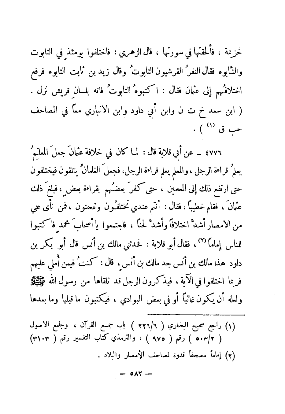 4776- عن أبي قلابة قال: "لما كان في خلافة عثمان جعل المعلم يعلم قراءة الرجل، والمعلم يعلم قراءة الرجل، فجعل الغلمان يتلقون فيختلفون حتى ارتفع ذلك إلى المعلمين، حتى كفر بعضهم بقراءة بعض، فبلغ ذلك عثمان" فقام خطيبا، فقال: "أنتم عندي تختلفون وتلحنون، فمن نأى عني من الأمصار أشد اختلافا وأشد لحنا، فاجتمعوا يا أصحاب محمد فاكتبوا للناس إماما"2 فقال أبو قلابة: "فحدثني مالك بن أنس قال أبو بكر بن داود هذا مالك بن أنس جد مالك بن أنس" قال: "كنت فيمن أملي عليهم فربما اختلفوا في الآية، فيذكرون الرجل قد تلقاها من رسول الله صلى الله عليه وسلم ولعله أن يكون غائبا أو في بعض البوادي، فيكتبون ما قبلها وما بعدها