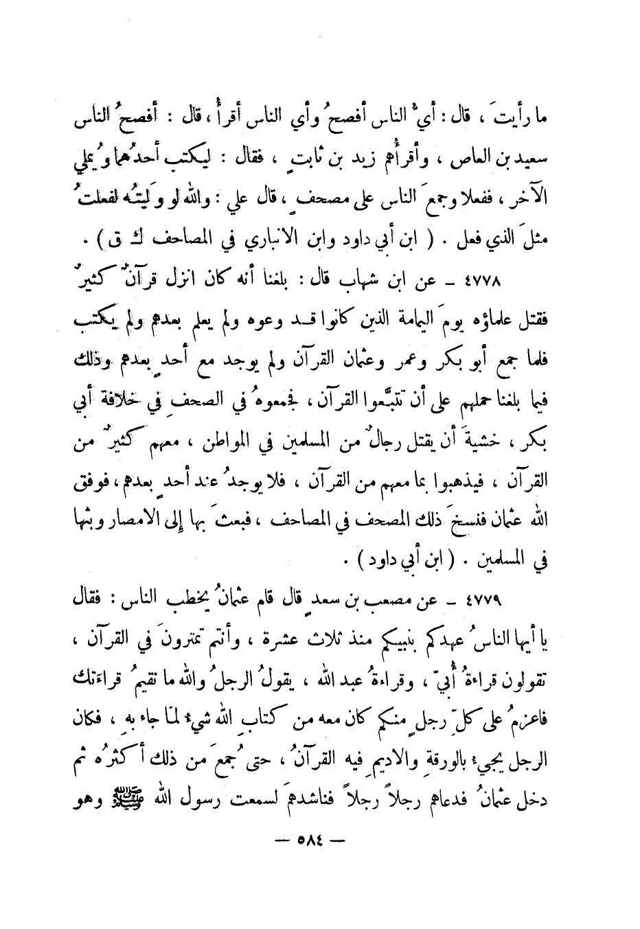 4778- عن ابن شهاب قال: "بلغنا أنه كان أنزل قرآن كثير فقتل علماؤه يوم اليمامة الذين كانوا قد وعوه ولم يعلم بعدهم ولم يكتب فلما جمع أبو بكر وعمر وعثمان القرآن ولم يوجد مع أحد بعدهم وذلك فيما بلغنا حملهم على أن تتبعوا القرآن، فجمعوه في الصحف في خلافة أبي بكر، خشية أن يقتل رجال من المسلمين في المواطن، معهم كثير من القرآن، فيذهبوا بما معهم من القرآن، فلا يوجد عند أحد بعدهم، فوفق الله عثمان فنسخ ذلك المصحف، فبعث بها إلى الأمصار وبثها في المسلمين". "ابن أبي داود".