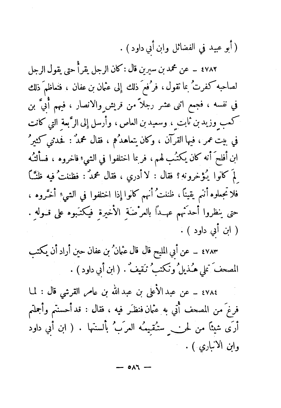 4782- عن محمد بن سيرين قال: "كان الرجل يقرأ حتى يقول الرجل لصاحبه كفرت بما تقول، فرفع ذلك إلى عثمان بن عفان، فتعاظم ذلك في نفسه، فجمع اثني عشر رجلا من قريش والأنصار، فيهم أبي بن كعب وزيد بن ثابت، وسعيد بن العاص، وأرسل إلى الربعة التي كانت في بيت عمر، فيها القرآن، وكان يتعاهدهم، فقال محمد: فحدثني كثير بن أفلح أنه كان يكتب لهم، فربما اختلفوا في الشيء فأخروه، فسألته لم كانوا يؤخرونه؟ فقال: لا أدري، فقال محمد: فظننت فيه ظنا فلا تجعلوه أنتم يقينا، ظننت أنهم كانوا إذا اختلفوا في الشيء أخروه، حتى ينظروا أحدثهم عهدا بالعرضة الأخيرة فيكتبوه على قوله". "ابن أبي داود".