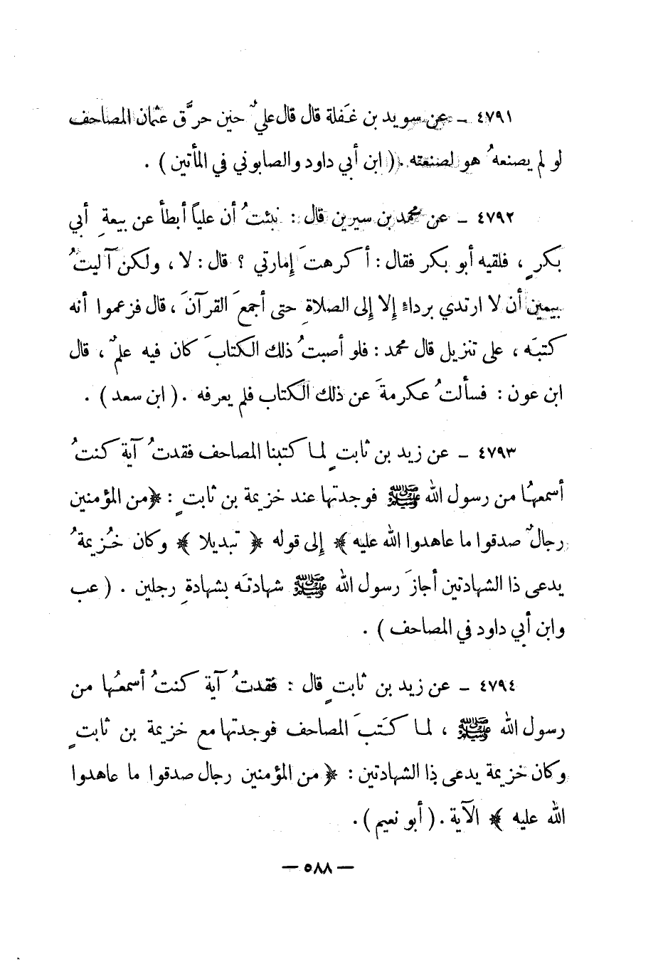4792- عن محمد بن سيرين قال: "نبئت أن عليا أبطأ عن بيعة أبي بكر، فلقيه أبو بكر فقال: "أكرهت إمارتي؟ قال: لا، ولكن آليت بيمين أن لا أرتدي برداء إلا إلى الصلاة حتى أجمع القرآن، قال فزعموا أنه كتبه، على تنزيل" قال محمد: "فلو أصبت ذلك الكتاب كان فيه علم، قال ابن عون: فسألت عكرمة عن ذلك الكتاب فلم يعرفه". "ابن سعد".