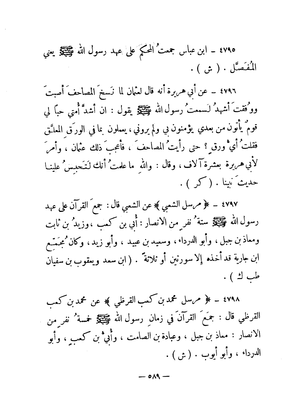 4797- "مرسل الشعبي" عن الشعبي قال: "جمع القرآن على عهد رسول الله صلى الله عليه وسلم ستة نفر من الأنصار: أبي بن كعب، وزيد بن ثابت ومعاذ بن جبل، وأبو الدرداء، وسعيد بن عبيد، وأبو زيد، وكان مجمع ابن جارية قد أخذه إلا سورتين أو ثلاثة". "ابن سعد ويعقوب بن سفيان طب ك".