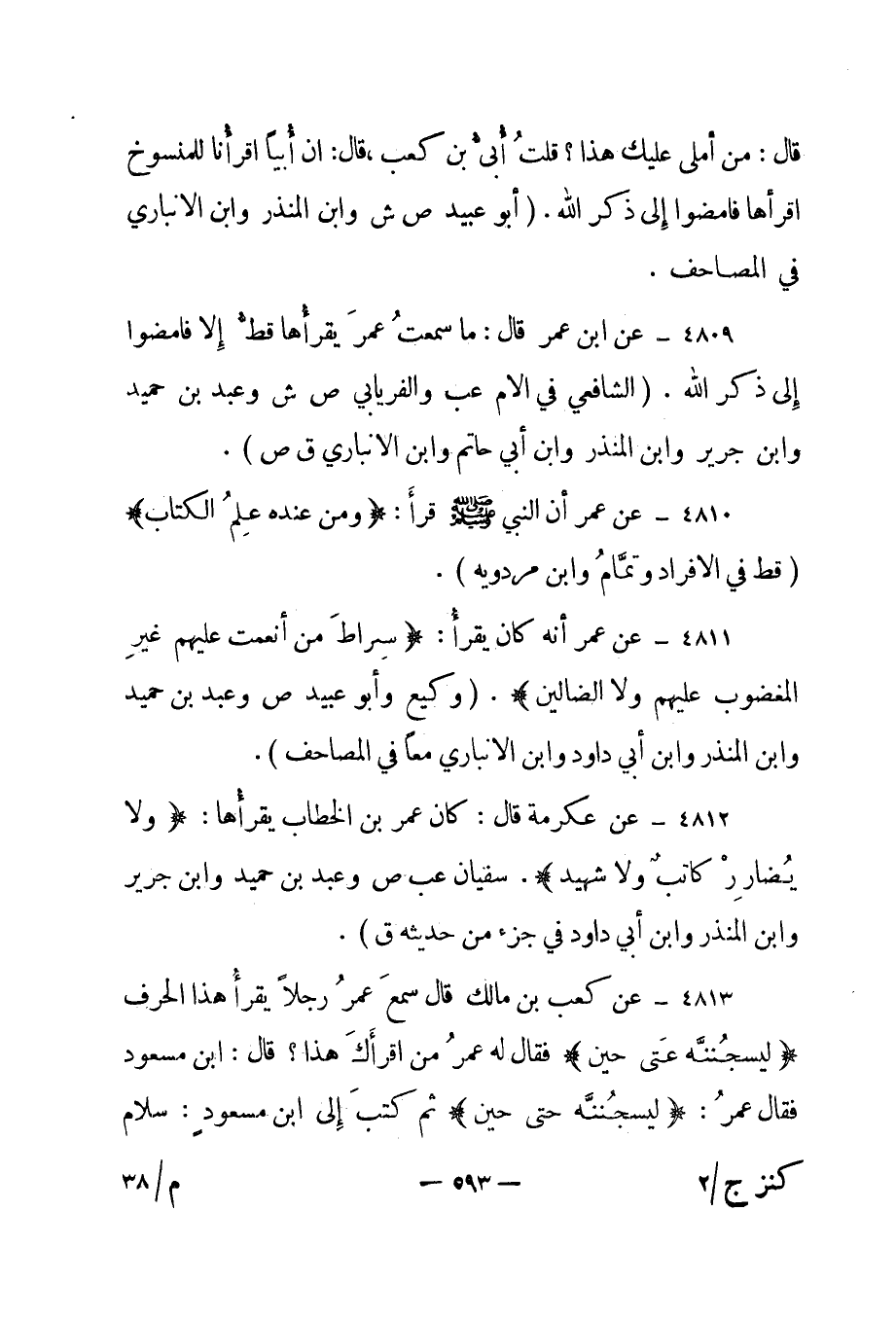 4811- عن عمر أنه كان يقرأ: {سراط من أَنْعَمْتَ عَلَيْهِمْ غَيْرِ الْمَغْضُوبِ عَلَيْهِمْ وَلا الضَّالِّينَ} . "وكيع وأبو عبيد ص وعبد بن حميد وابن المنذر وابن أبي داود وابن الأنباري معا في المصاحف".