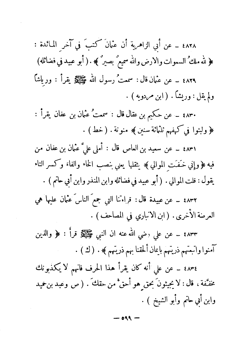 4832- عن عبيدة قال: "قراءتنا التي جمع الناس عثمان عليها هي العرضة الأخرى". "ابن الأنباري في المصاحف".