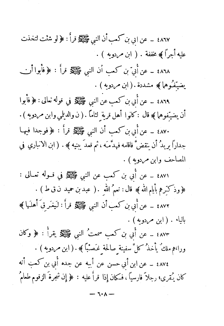 4873- عن أبي بن كعب سمعت النبي صلى الله عليه وسلم يقرأ: {وَكَانَ وَرَاءَهُمْ مَلِكٌ يَأْخُذُ كُلَّ سَفِينَةٍ صالحة غَصْباً} . "ابن مردويه".