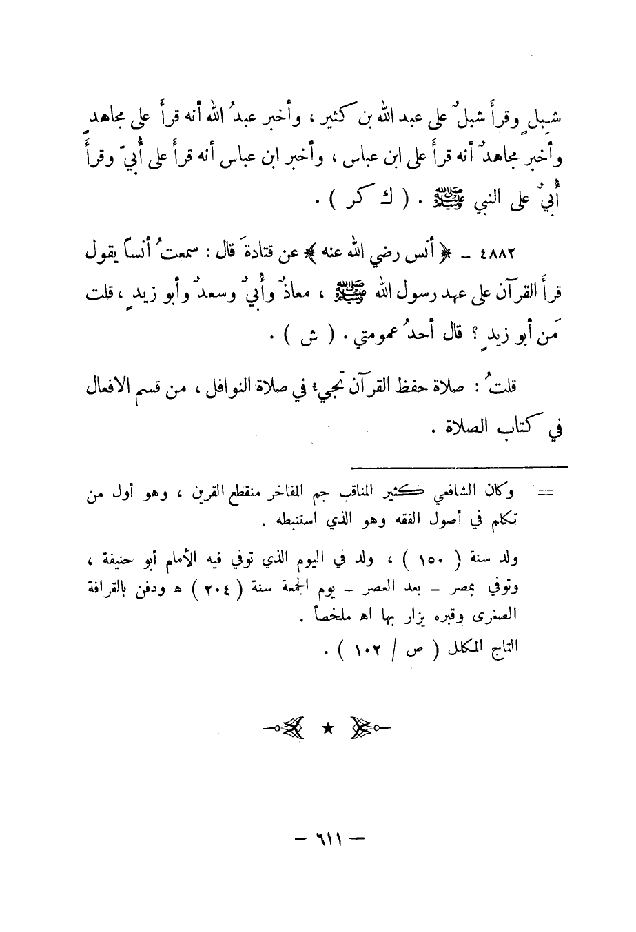 4882- "أنس رضي الله عنه" عن قتادة قال: سمعت أنسا يقول "قرأ القرآن على عهد رسول الله صلى الله عليه وسلم، معاذ وأبي وسعد وأبو زيد، قلت من أبو زيد؟ قال أحد عمومتي". "ش".