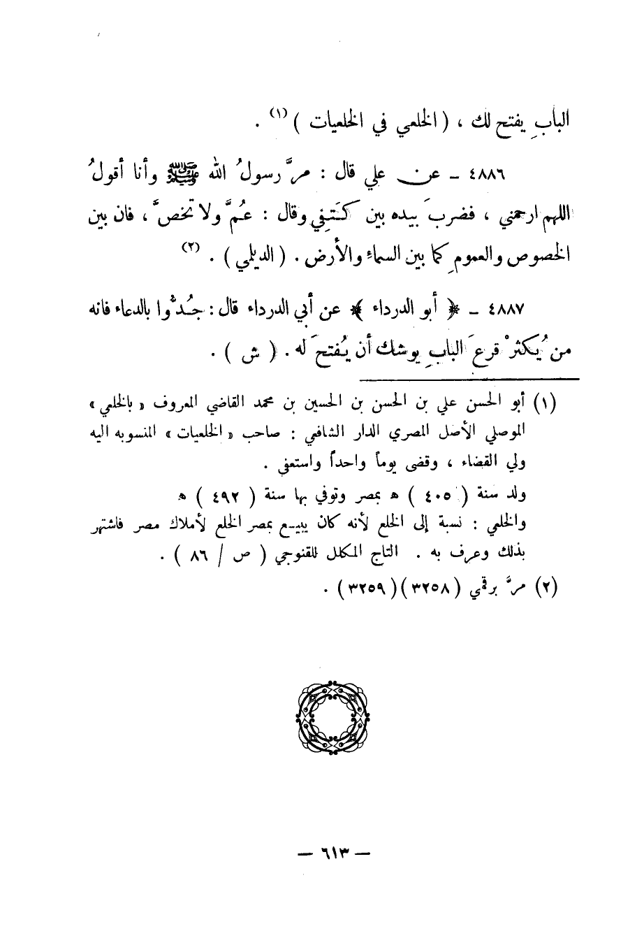 1 أبو الحسن علي بن الحسن بن الحسين بن محمد القاضي المعروف "بالخلعي" الموصلي الأصل المصري الدار الشافعي: صاحب "الخلعيات" المنسوبه إليه ولي القضاء، وقضى يوما واحدا واستعفى. ولد سنة "405" هـ بمصر وتوفي بها سنة "492" هـ