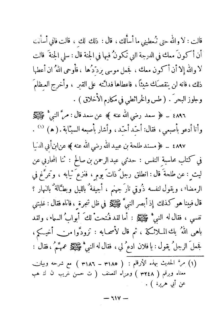 4897- "مسند طلحة بن عبيد الله رضي الله عنه" عن ابن أبي الدنيا في كتاب محاسبة النفس: حدثني عبد الرحمن بن صالح: ثنا المحاربي عن ليث: عن طلحة قال: "انطلق رجل ذات يوم، فنزع ثيابه، وتمرغ في الرمضاء، ويقول لنفسه ذوقي نار جهنم، أجيفة بالليل وبطالة بالنهار؟ قال فبينا هو كذلك إذ أبصر النبي صلى الله عليه وسلم في ظل شجرة، فأتاه فقال: غلبتني نفسي، فقال له النبي صلى الله عليه وسلم: "أما لقد فتحت لك أبواب السماء، ولقد باهى الله بك الملائكة، ثم قال لأصحابه: تزودوا من أخيكم"، فجعل الرجل يقول: يا فلان ادع لي، فقال له النبي صلى الله عليه وسلم عمهم، فقال: