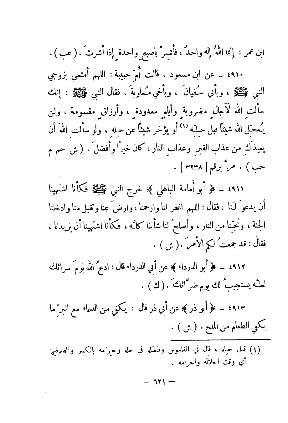 4910- عن ابن مسعود، قالت أم حبيبة: "اللهم أمتعني بزوجي النبي صلى الله عليه وسلم، وبأبي سفيان، وبأخي معاوية، فقال النبي صلى الله عليه وسلم: إنك سألت الله لآجال مضروبة وأيام معدودة، وأرزاق مقسومة، ولن يعجل الله شيئا قبل حله1 أو يؤخر شيئا عن حله، ولو سألت الله أن يعيذك من عذاب القبر وعذاب النار، كان خيرا وأفضل". "ش حم م حب". مر برقم [3238] .